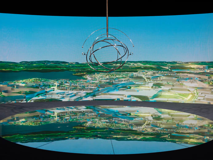 While contemplating “how technology has transformed our vision of time and space”, Ratte got the idea to use images from satellites and Google maps and then give them “a magical, utopian spin to them”. In practice, this became a large video screen that spanned the entrance of the Hermes pavilion, with the looping scenography depicting colourful, reimagined landscapes. For the rest of the space, Ratte created 12 interactive window displays for visitors to interact with, and view the watches within them in different video scenes.