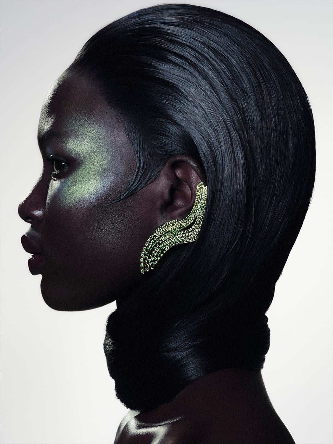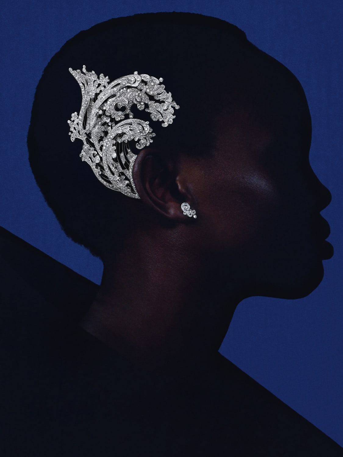 The Iceberg necklace uses sandblasted rock crystal to replicate frosted ice, with diamonds embedded invisibly for a levitating effect. Doubling as a hair jewel, the asymmetrical Vague earrings are inspired by a 1910 Chaumet tiara that drew from Hokusai’s The Great Wave and showcases hand-sculpted gold adorned with 851 diamonds.