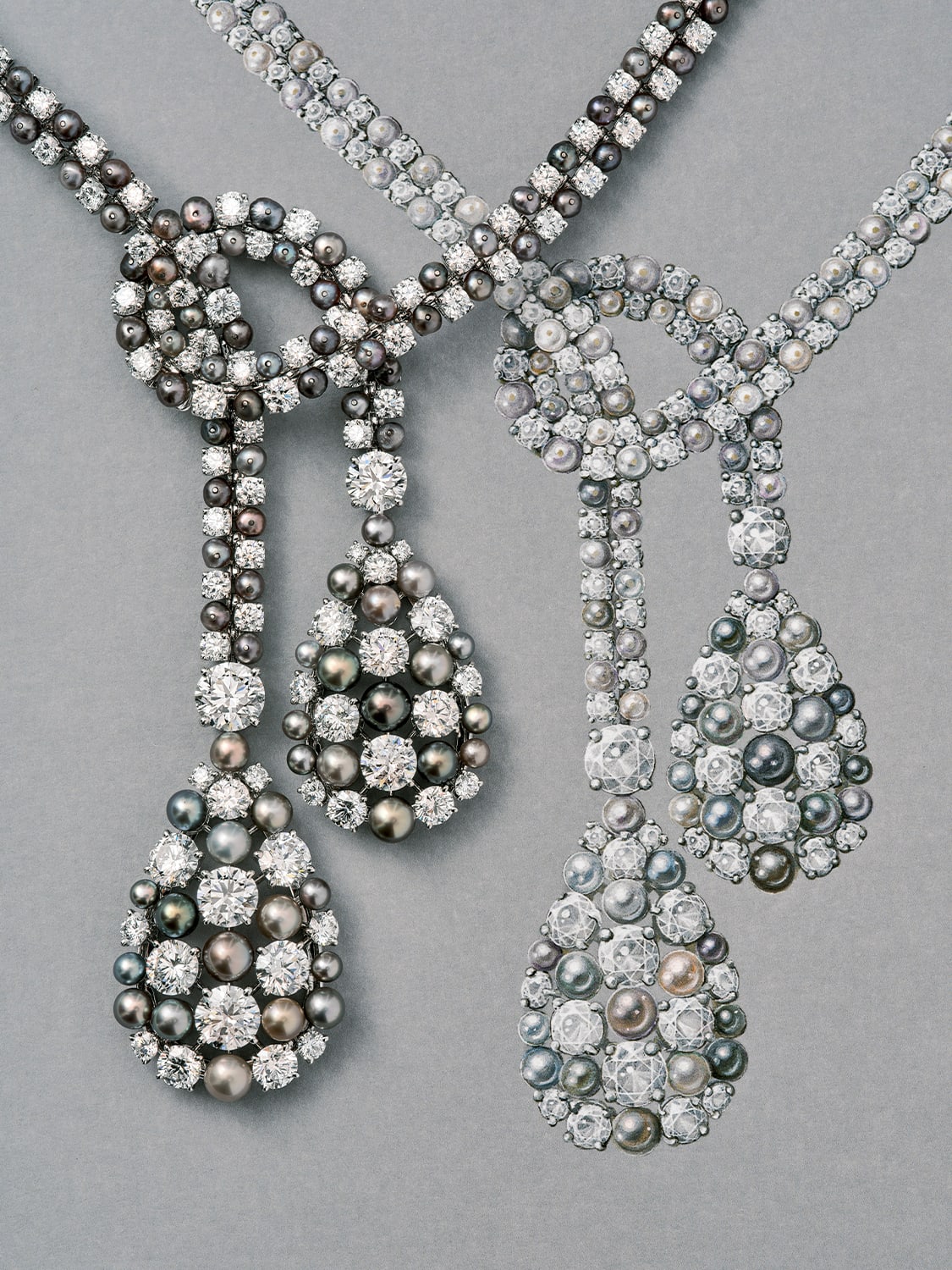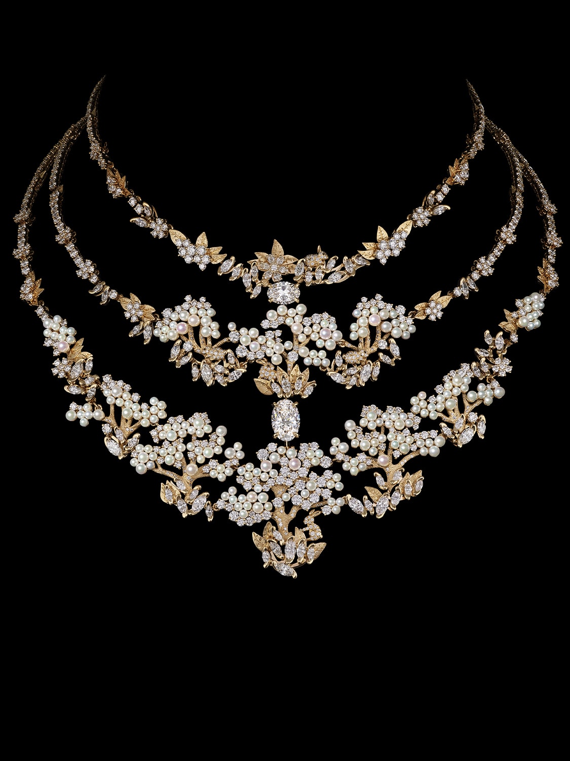 Equally enchanting is the Trompe-l’oeil negligee necklace from the collection’s third chapter, Magic. Named after the French art technique meaning “fool the eye”, where objects are depicted with striking realism, this necklace flaunts a masterful setting of pearls and diamonds that’s designed to look like a single, large gem. As every pearl differs in shape and size, Chaumet gem-setters had to meticulously select and align each one alongside diamonds to achieve a flawless optical illusion.