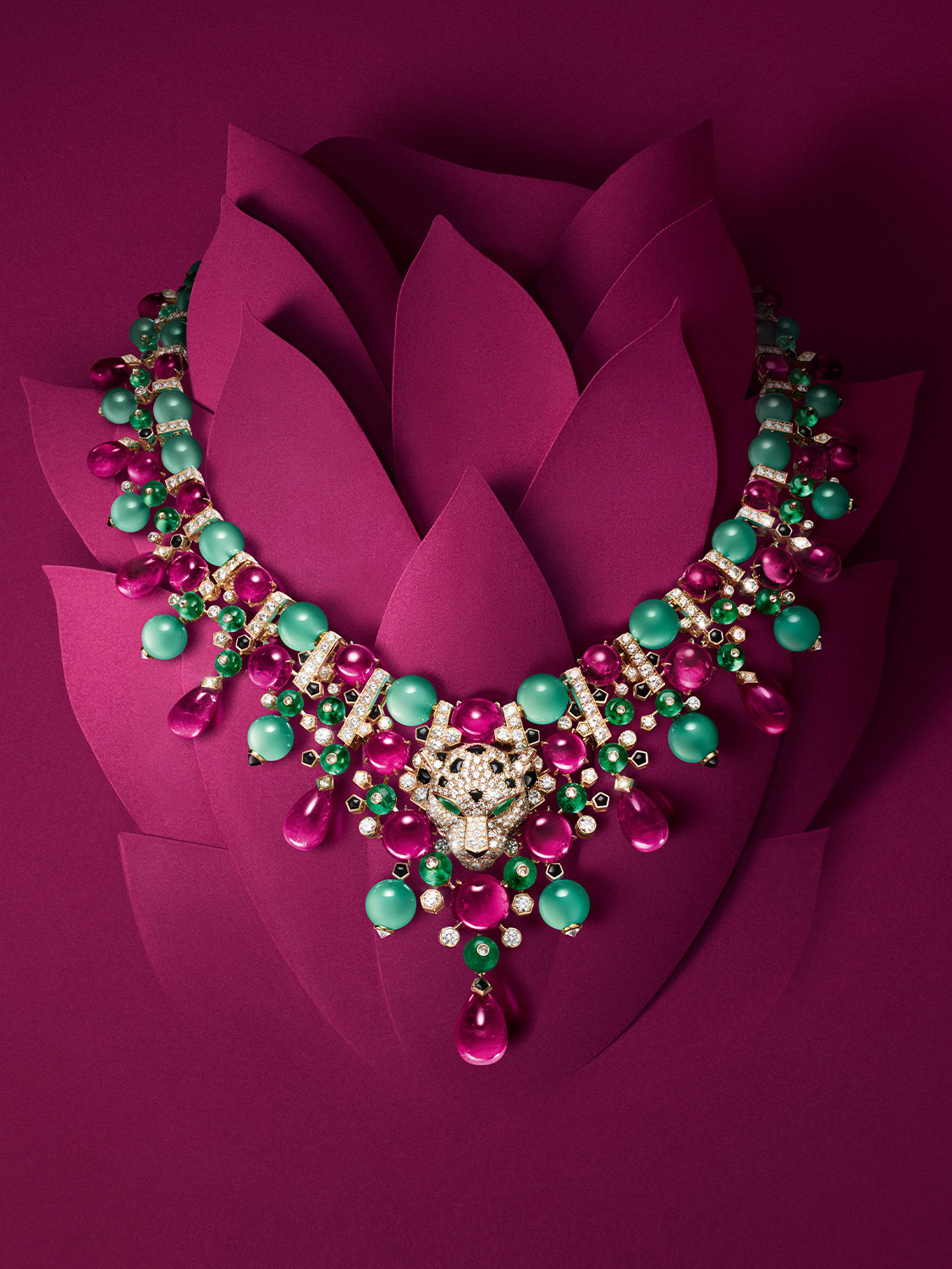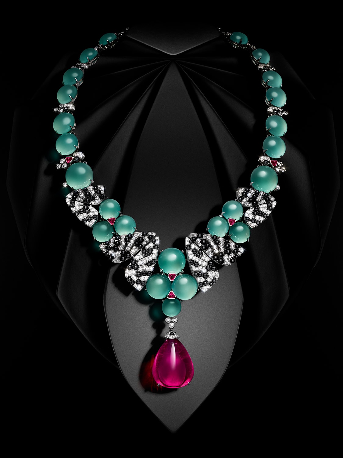 This high jewellery collection has four hero pieces. The Chryseis necklace captures the delicate grace of butterfly wings with black-and-white patterns contrasting against chalcedony beads and a 63.76-carat rubellite. The Vamana Necklace reimagines the elephant with geometric forms, emerald eyes, kite-shaped diamonds and intricate openwork, merging figurative and abstract styles. Meanwhile, the Panthere Chatoyante showcases Cartier's iconic panther, its emerald gaze complemented by rubellites, chrysoprases, and onyx, evoking the feline's coat, while the Sibaya necklace reinterprets crocodile scales as sugarloaf emeralds, with diamond motifs suggesting water’s shimmer.
