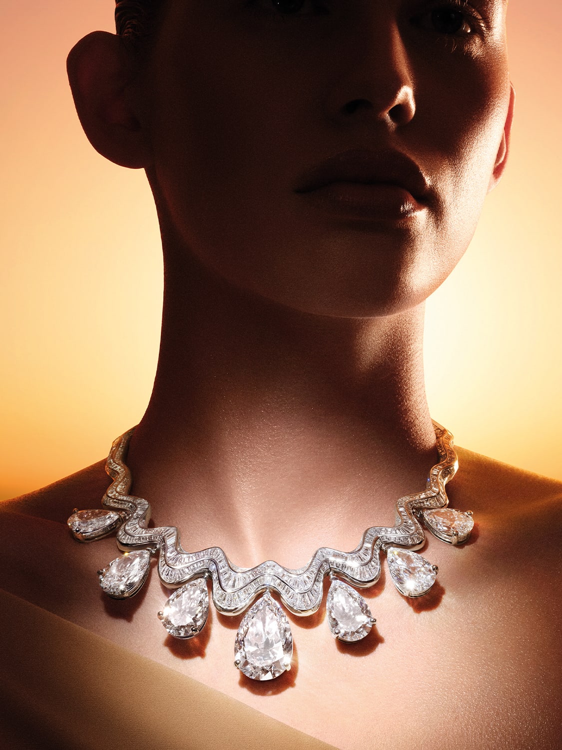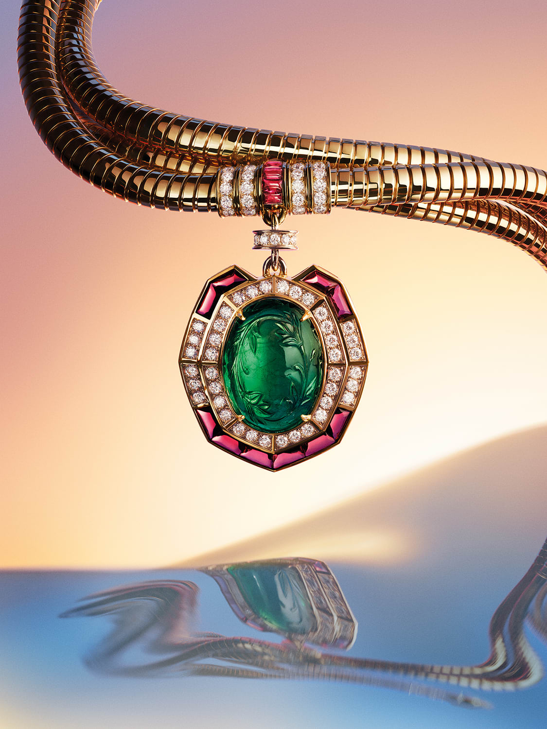 The collection’s crowning masterpiece is the €40 million Serpenti Aeterna necklace. It flaunts seven pear-shaped D flawless diamonds, totalling 140 carats (one for each year of Bvlgari’s history), cut from a 200-carat rough diamond. The Aurea Chandra choker revisits the bold ’80s with its radiant gold and diamond spheres, while the Tubogas Flower of Time necklace combines the house’s iconic Tubogas design with a 31.07-carat floral-engraved Zambian emerald, rubellites and pave diamonds.