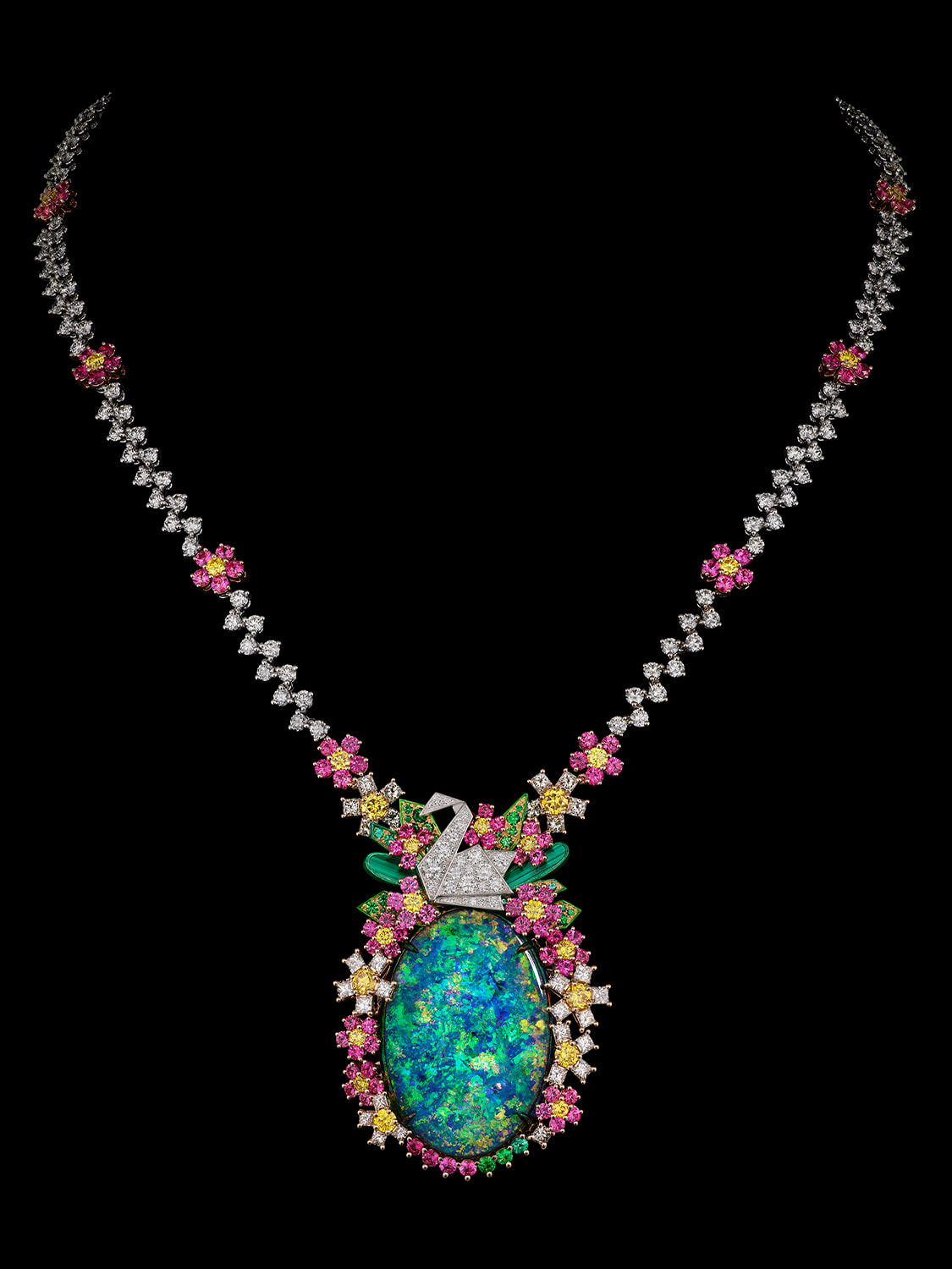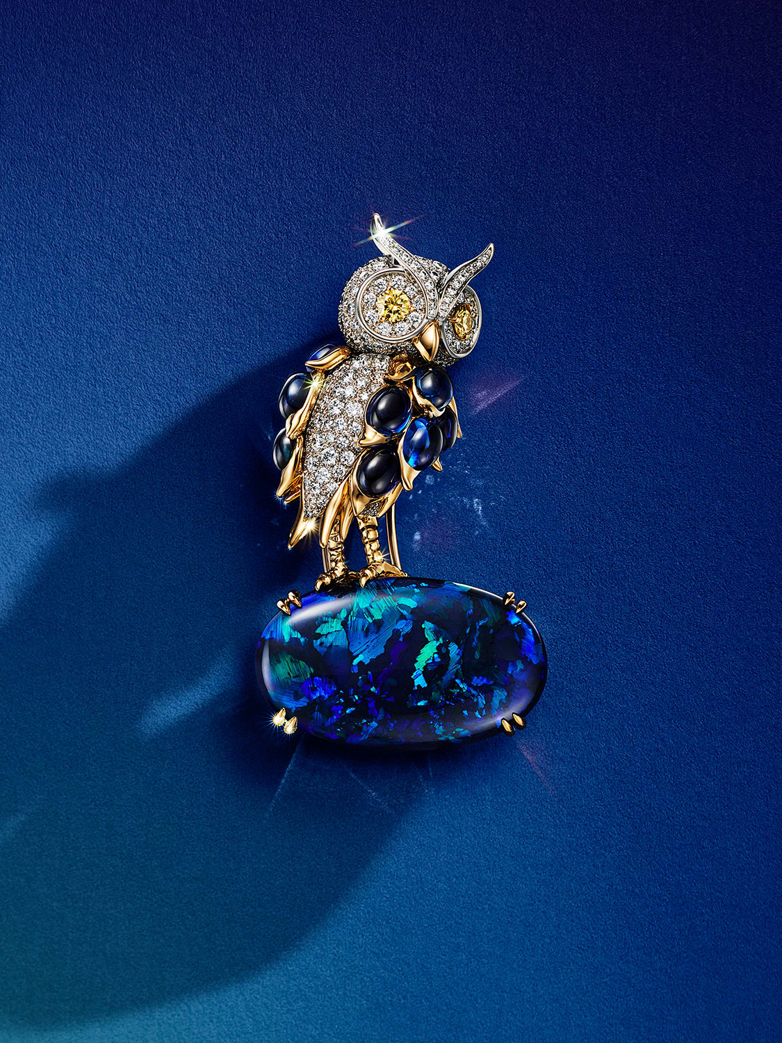The gorgeous Owl on a Rock brooches, featuring the nocturnal bird perched on a “moon rock” like black opal, moonstone and star sapphire, are a modern take on the house’s iconic Bird on a Rock. The fiery Phoenix chapter symbolises rebirth with gemstones like rubellites and fire opals. Next, the Unicorn designs take inspiration from Schlumberger’s Crazy Twist designs, highlighting diamond-encrusted twists with rich purple and pink sapphires. A key piece of this chapter is an imaginative Unicorn brooch with a magical bicolour cushion-cut tourmaline of over 25 carats. Lastly, the Star Burst chapter is an ode to galaxies with high starburst activity. Its designs exhibit brilliant luminosity, such as a necklace flaunting six oval cabochon crystal opals of over 64 total carats and diamonds.