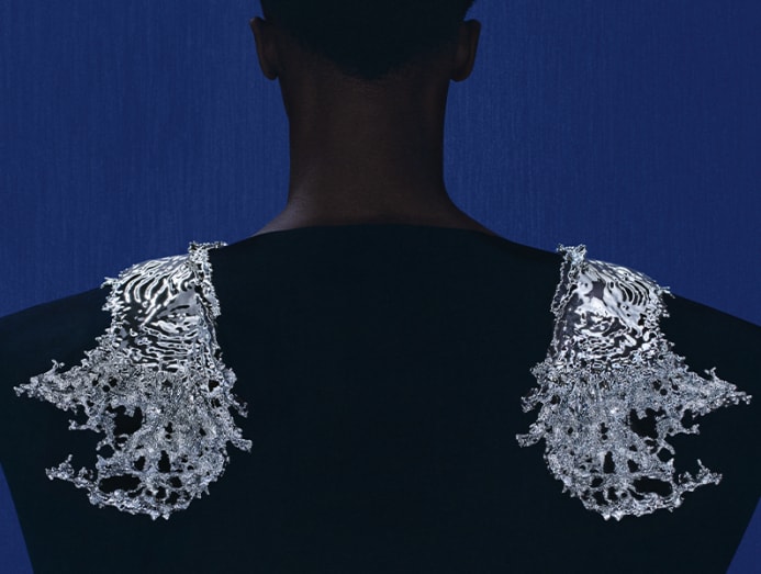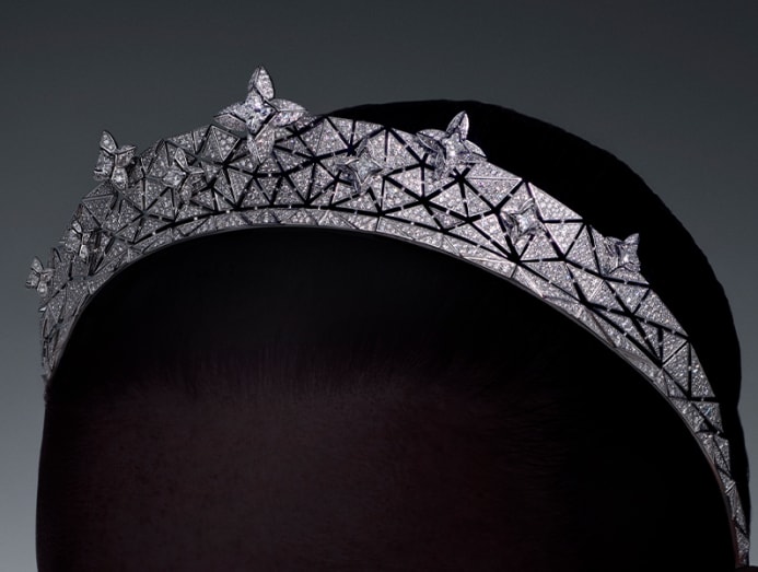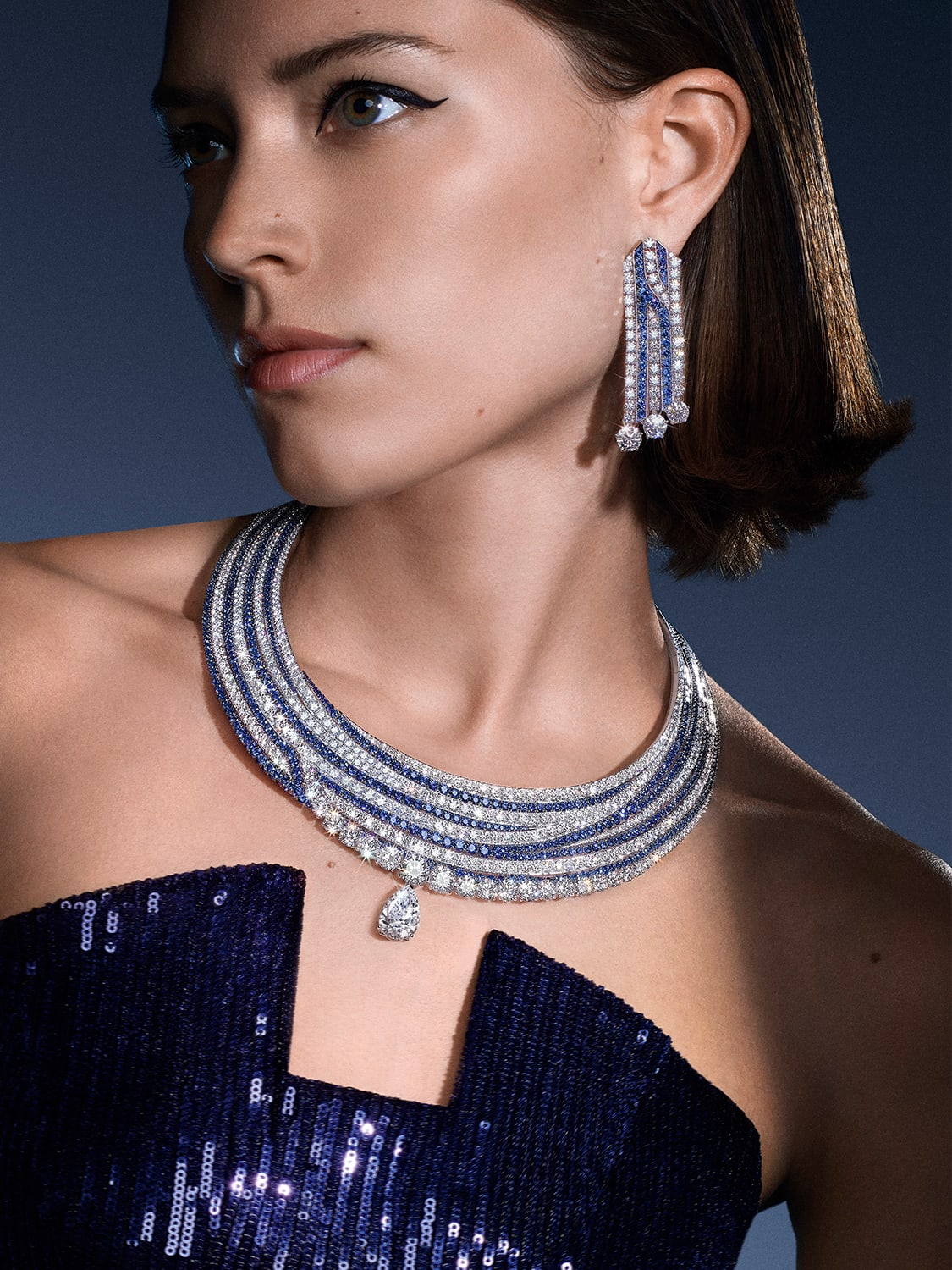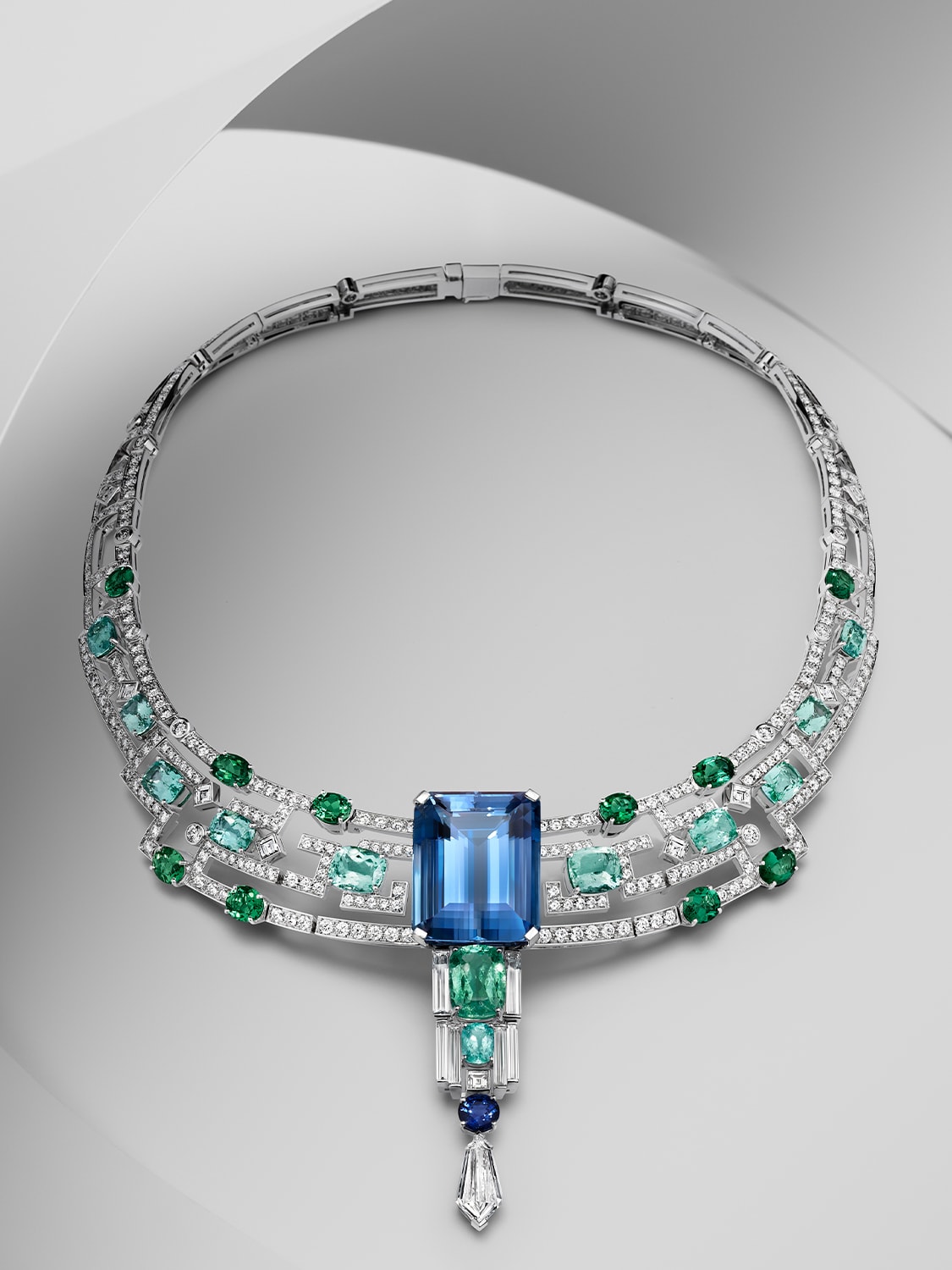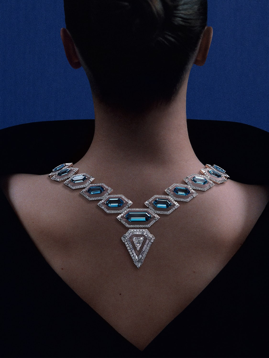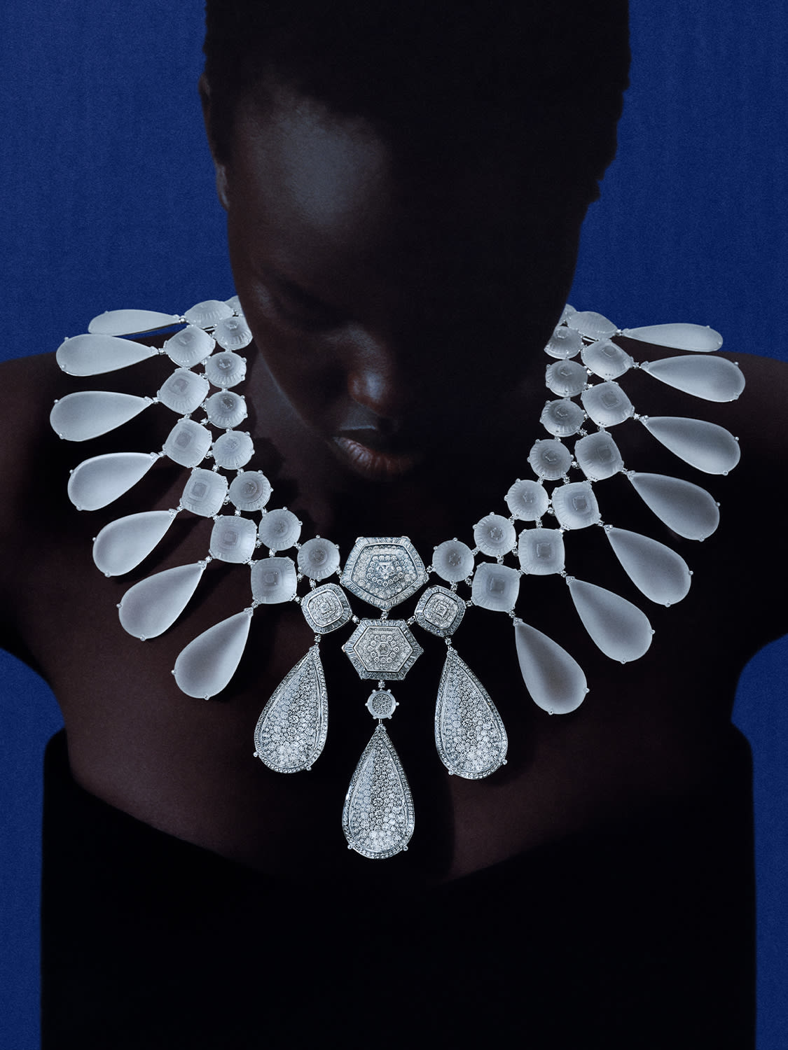 For a dramatic flourish, the Eau Vive shoulder brooches are feats of engineering and artistry with sculpted aluminium waves embellished with diamonds. Taking 2,560 hours to complete is the Cristaux necklace, a glacial wonder of 24 aquamarines, diamonds, and hexagonal rock crystals, all anchored by a dazzling 5.06-carat diamond.