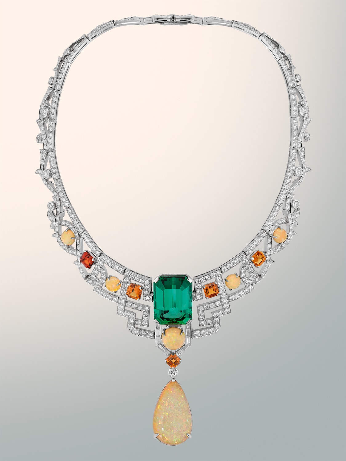 From left: Cartier Nature Sauvage Sibaya necklace & Hermes Les Formes de la Couleur Arc en Couleurs rose gold necklace with sapphires, tsavorites, spessartite garnets, tanzanites, amethysts and diamonds. (Photos: Cartier & Hermes)