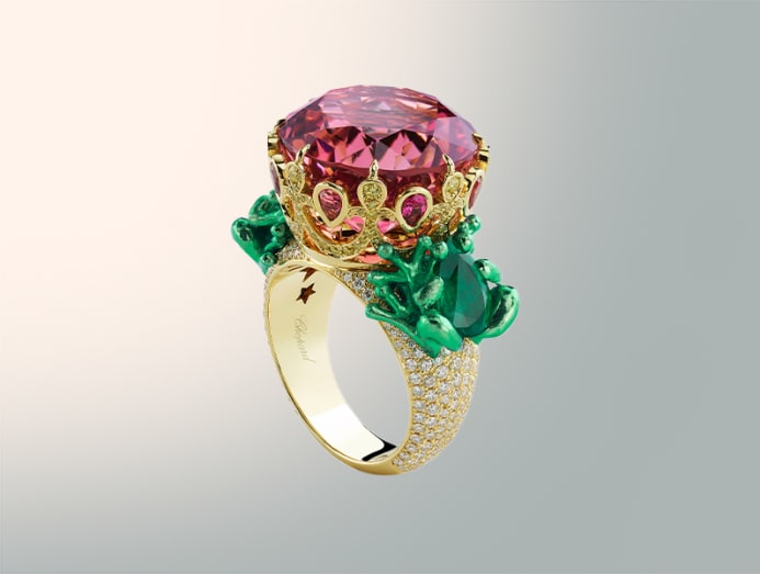 Encapsulating the collection’s ethereal charm are a stunning diamond tiara adorned with a fairy that can be detached to be worn as a brooch, a pair of butterfly earrings with two stunning pear-shaped aquamarines totalling over 27 carats, and a charming frog-themed ring boasting a 17.7-carat rubellite crown.