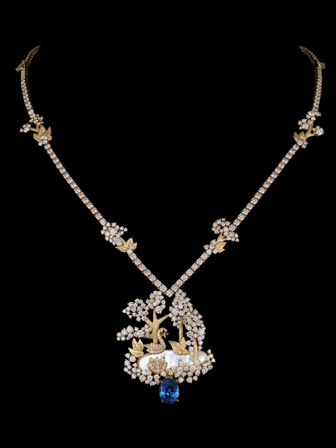 Among the standouts is the Harmony necklace from the first act Music that features a jaw-dropping 8.72-carat pear-shaped diamond. Artisans took 1,800 hours to complete the articulated masterpiece, partly because it required them to create 700 bezel settings and 2,800 claw settings to hold each diamond and blue sapphire.