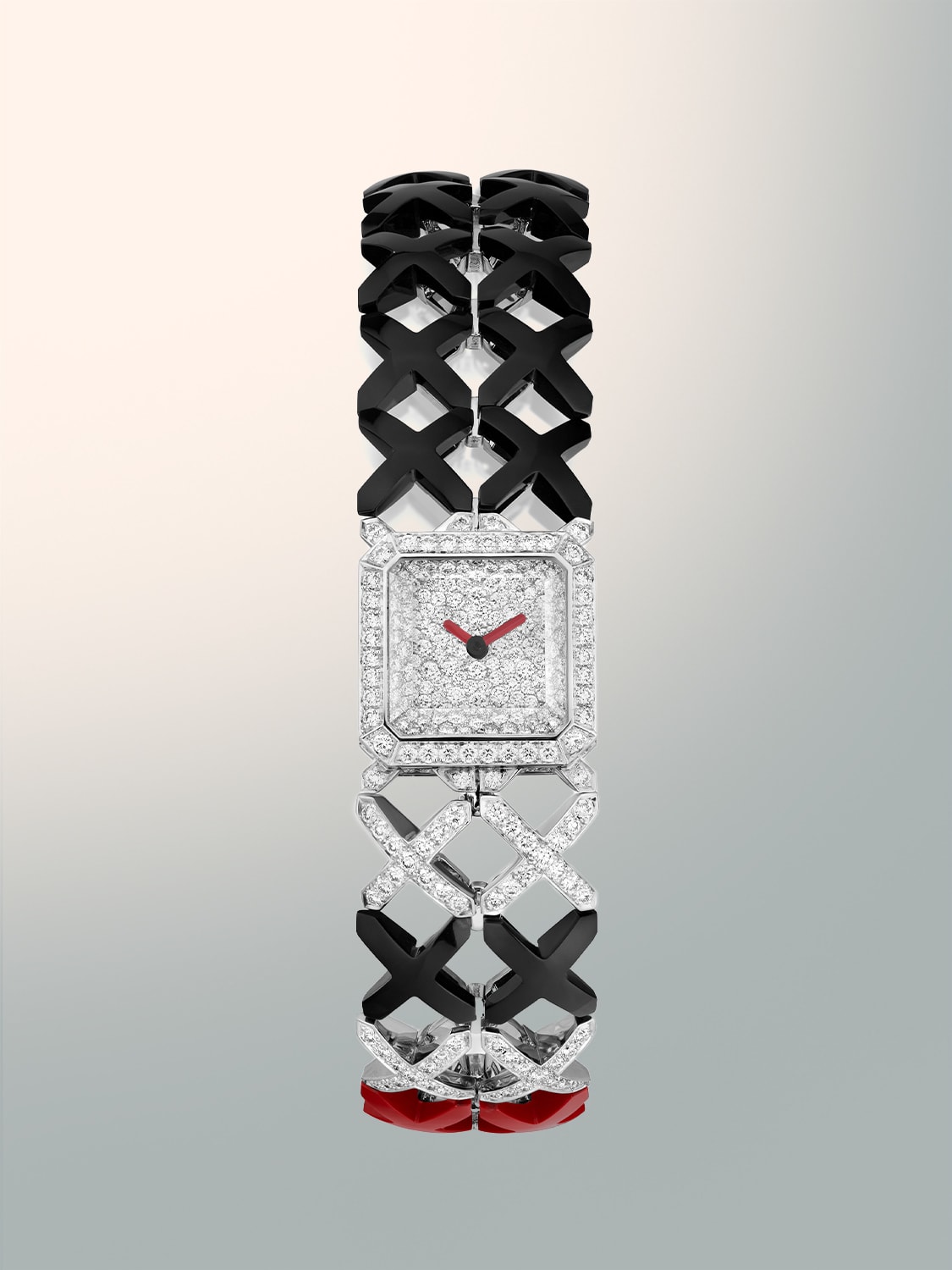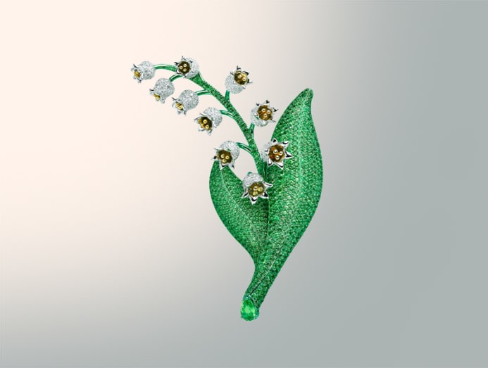 The maison’s jewellery-making expertise takes centre stage with a brooch featuring a titanium sprig of lily of the valley adorned with diamond-set bell-shaped flowers and yellow gold pistils. The choice of lightweight titanium not only allows for larger-sized creations, which would otherwise be impossible to achieve in gold, to be made but also be tinted in a myriad colours via the method of anodisation.
