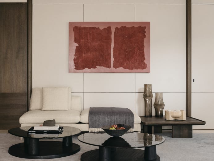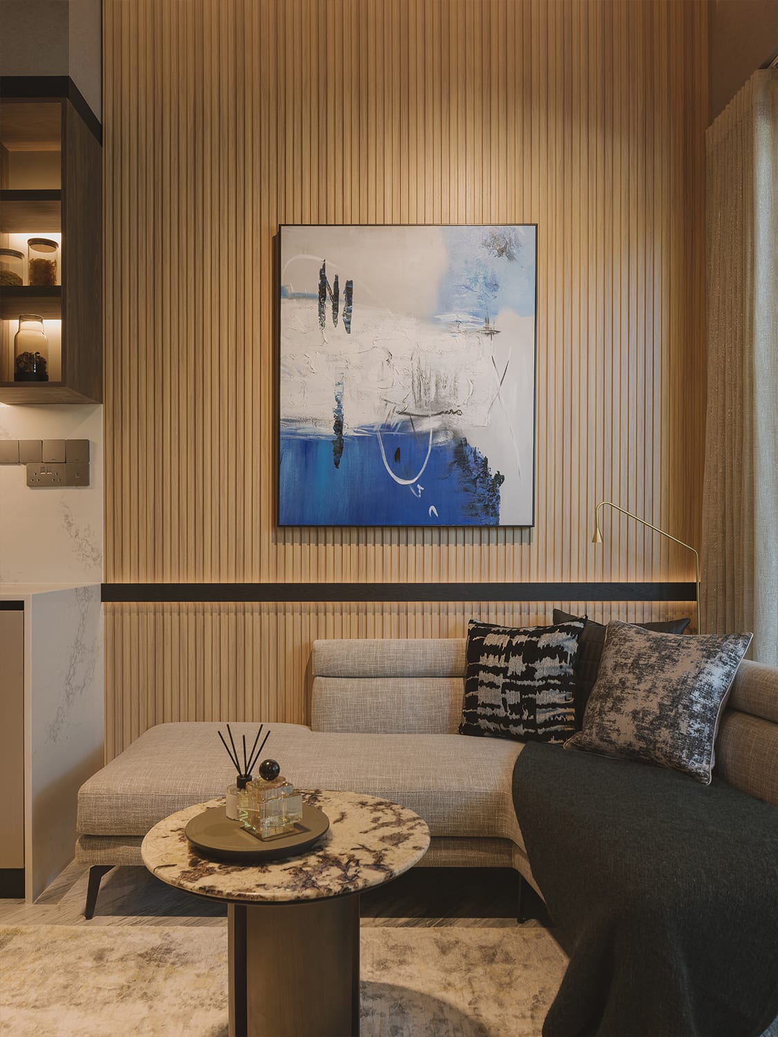 A backdrop of cream, grey, taupe and chocolate shades make this home a tranquil respite. A smoked ash veneer wall panel spans the length of the living, dining and staircase is a harmonising element, while a long, custom-designed dining table and curated furniture selection help elevate the unit’s existing spatial qualities.