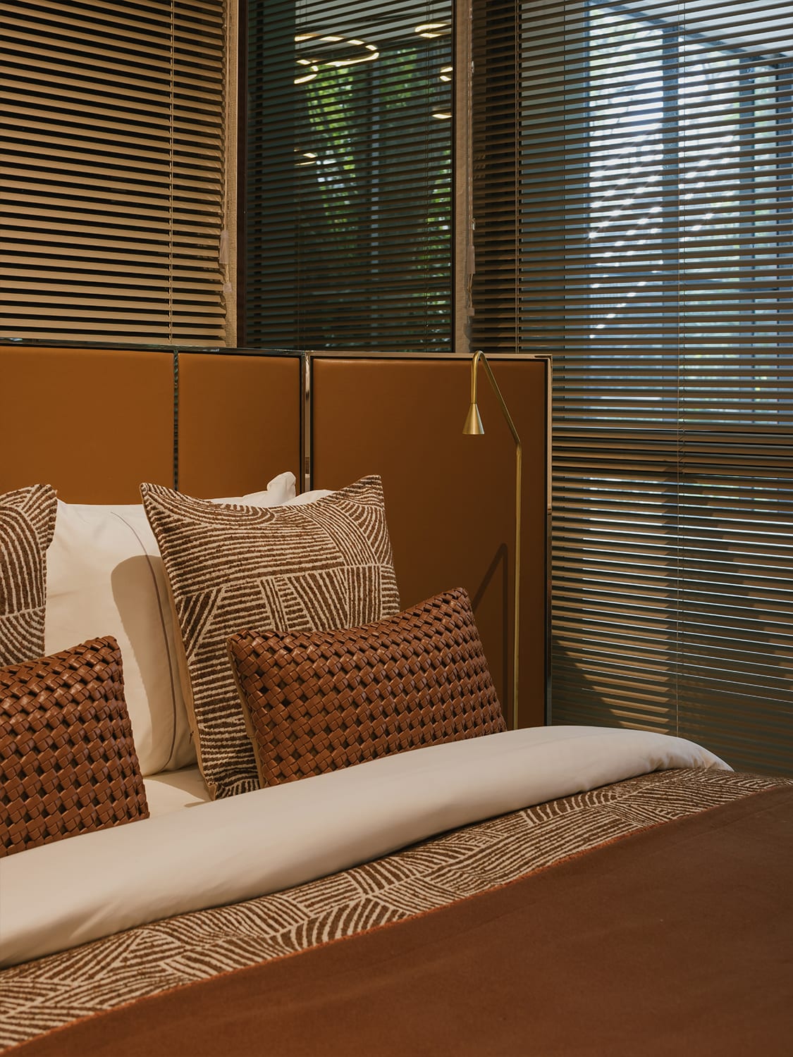 To make neutral spaces interesting, Lim added subtle cultural references, such as a bed headboard in the one-bedroom unit inspired by Japanese byobu folded panels, and another bed headboard in the two-bedroom unit with a French-winged style but updated with polished stainless-steel framing and cognac leather.