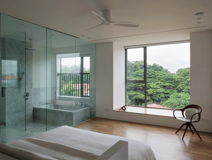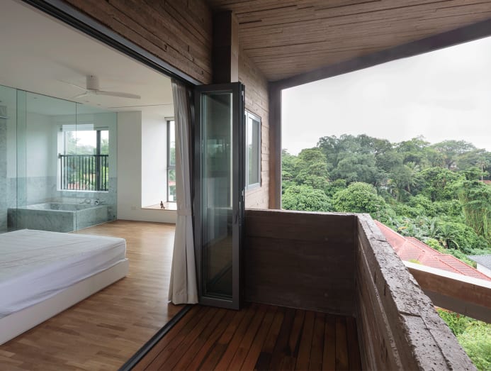 Bedroom windows facing the patio give the occupants privacy from neighbours without sacrificing on views and breeze. “This design enables the rooms and internal spaces to always stay open, letting in wind through the covered patio and affecting natural ventilation,” Yip explained.