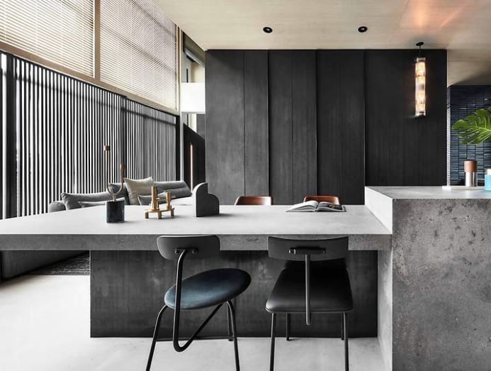 A six-metre-long food counter integrates the kitchen and dining. It is read as a series of clean-cut monoliths made from concrete-finish Caesarstone panels atop a burnished steel base. “For their typical day, quick breakfasts and longer, intimate meals are prepared from counter to table in a fuss-free way,” said Cheok.