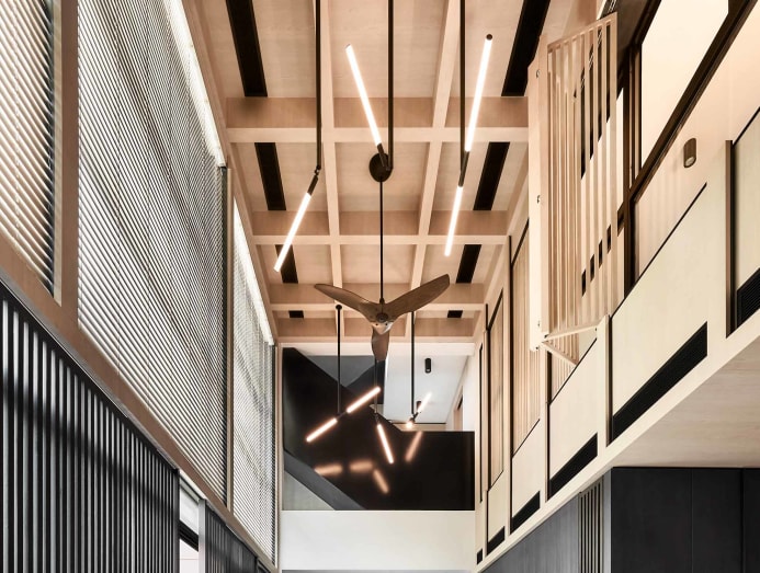 In this home, it is not only the outward views that fascinate, but the upward ones as well. “Each wall was divided horizontally and then vertically, arriving at its own grid when they meet the ceiling. We extruded the grid into a three-dimensional timber lattice, unifying the walls and lending a framework for a complex series of fans and lights overhead,” said Cheok.