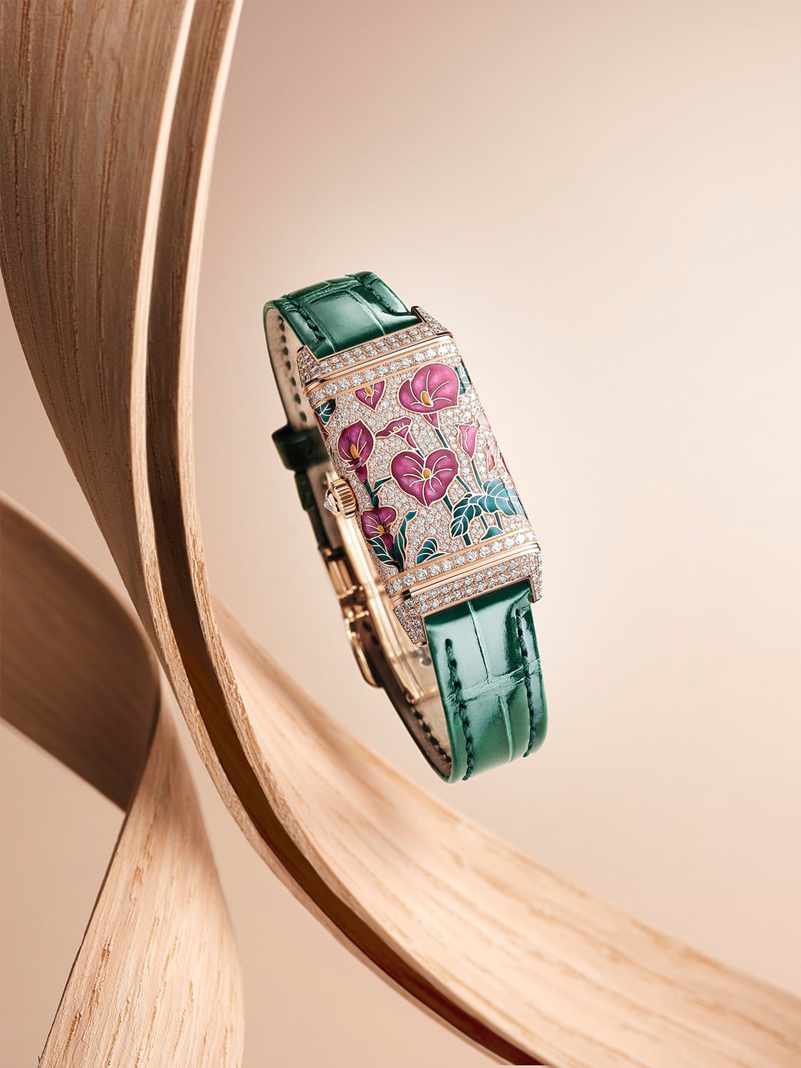 Like most metiers d’art watches, the Reverso One Precious Flowers series is a culmination of several artistic disciplines. This time, the Ateliers des Metiers Rares relied on engraving and enamelling on top of gem-setting to create the luscious leaves and petals of lilies and arums in four stunning models.