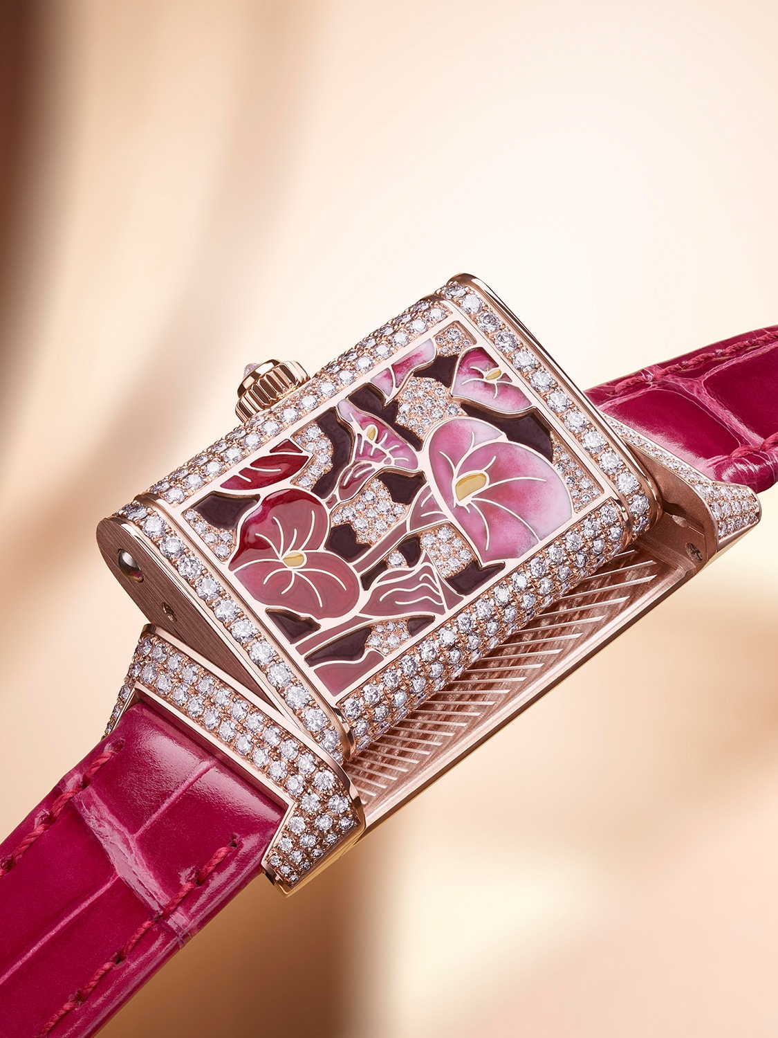 The petals of the Pink Arums are executed in the same way, but diamonds fill in its leaves and black lacquer was used to create its dramatically contrasting background. Both of these images are framed in grain-set diamonds that cover the entire case.