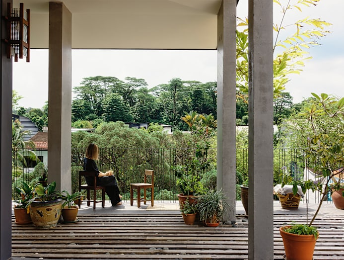 The renovation expands the family home with an exposed-concrete frame and attic storey, while reusing materials and layering in Peranakan touches, heirlooms and vintage finds.