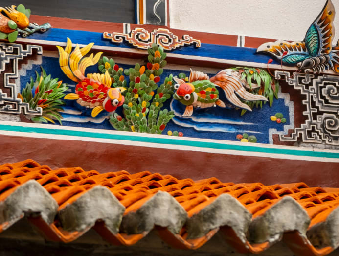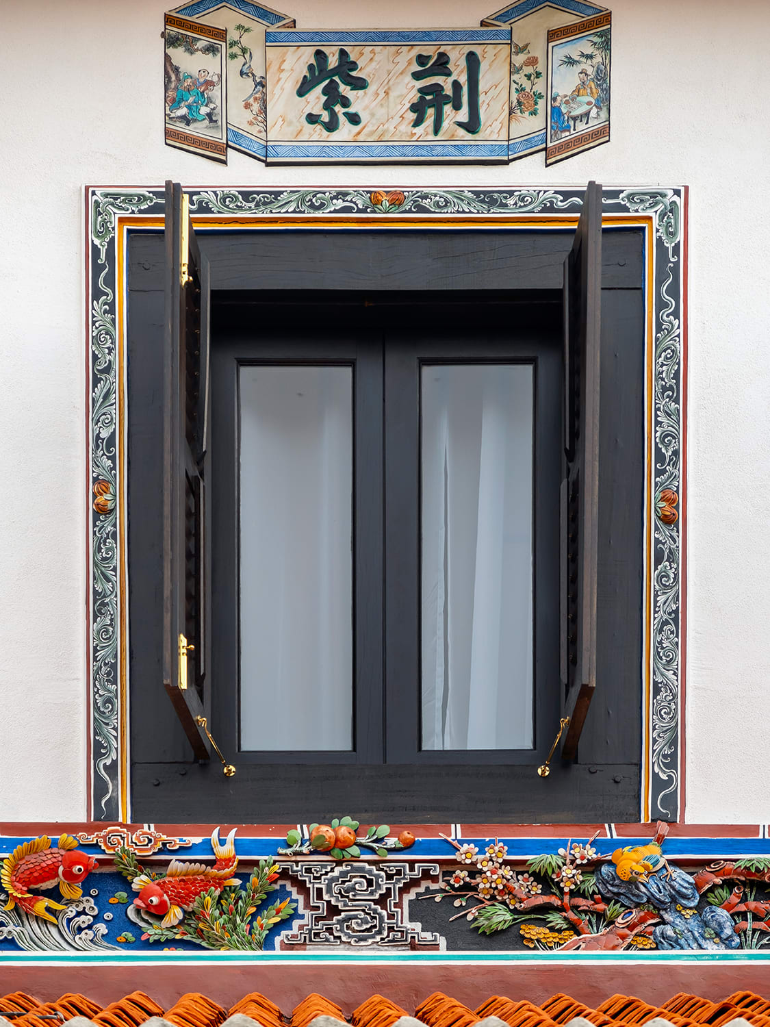 The facade was brought back to its previous glory with the addition of traditional Jian Nian (ceramic cut-and-paste shard-work). “We found some artisans from China who were doing temple restoration in another location and brought them here to add these flourishes to the facade,” explained Ker. These intricate details include a goldfish constructed from colourful porcelain bowls decorating a non-working rainwater pipe (rainwater was considered a Chinese symbol of wealth and abundance and was therefore revered).