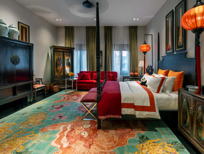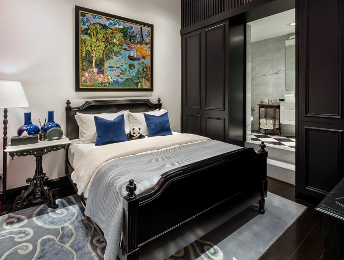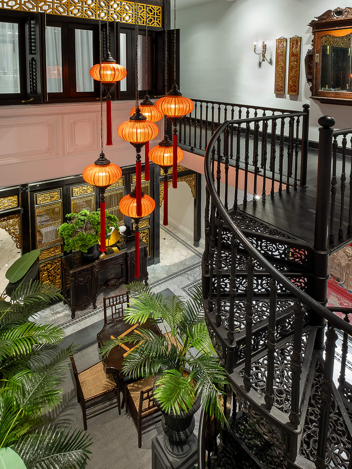 The fastidious attention to detail on the ground floor, with an emphasis on preserving its heritage charm, takes a turn for the modern in the four rooms upstairs. Seamlessly merging colonial aesthetics with vibrant colours and antique furnishings, Ker even installed air-conditioning in the bathrooms, deemed essential in the city’s notorious heat.