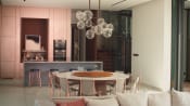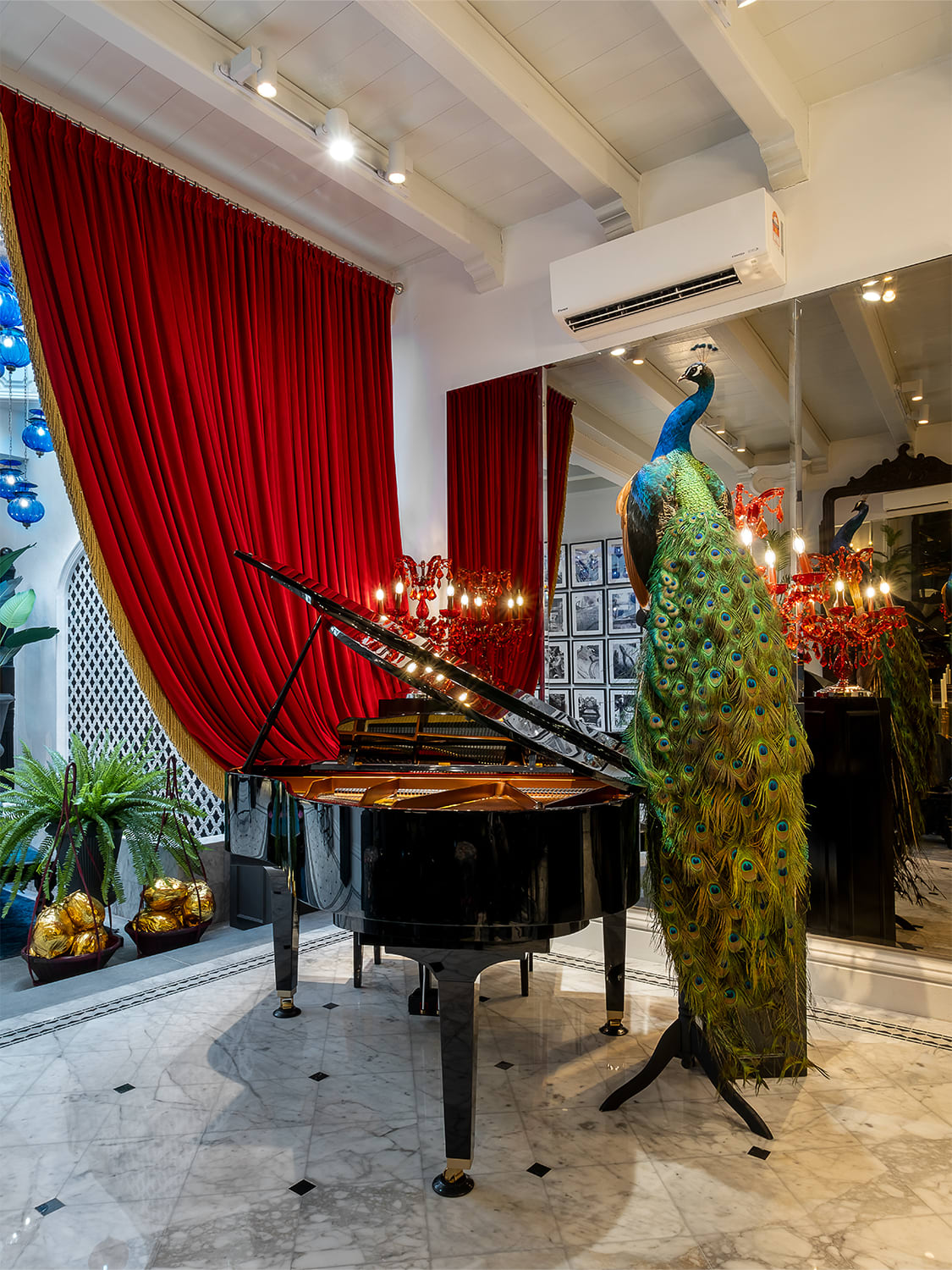 Where the thia abu (ancestral hall) and dapur (kitchen) would traditionally be located, the couple created a lounge anchored by a 15-ft custom-made marble-topped bar. Decorated with plush banquettes and lounge-style seating with a baby grand and taxidermised peacocks, the couple envisioned this as an ideal space for celebrations as it can comfortably seat up to 50 people. “With the bar and piano and plenty of spots to lounge, this place has all the makings of a party house,” Ker said with a smile.