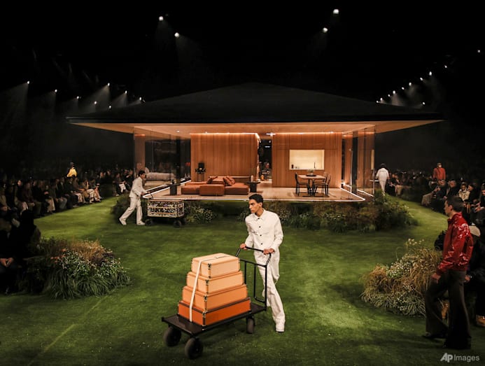 Then came the Vuitton wink at travel as culture-object: an Art Nouveau travel case in stained glass, rolled through on a trolley — absurd, beautiful, and perfectly on-message for a house that still sells the idea of departure as luxury.