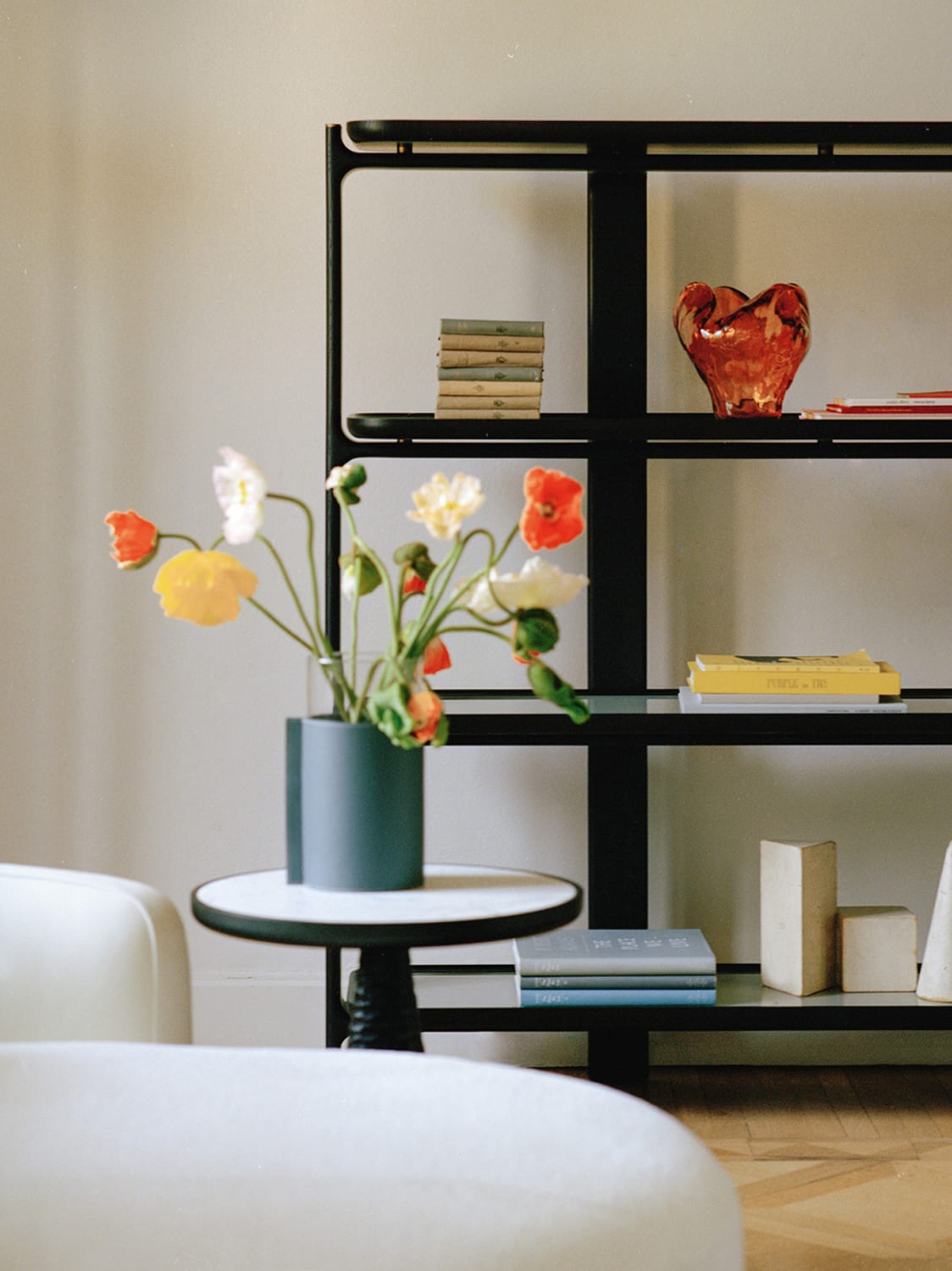 One of the pieces is this bookshelf designed by Roberto Lazzeroni. It comprises Ash wood frames and shaded bronze finish details. Upon request, a marble or black-painted glass top can be inserted inside the shelf frames for a more elegant profile. It comes in two or four tiers, and is available at Proof Living.