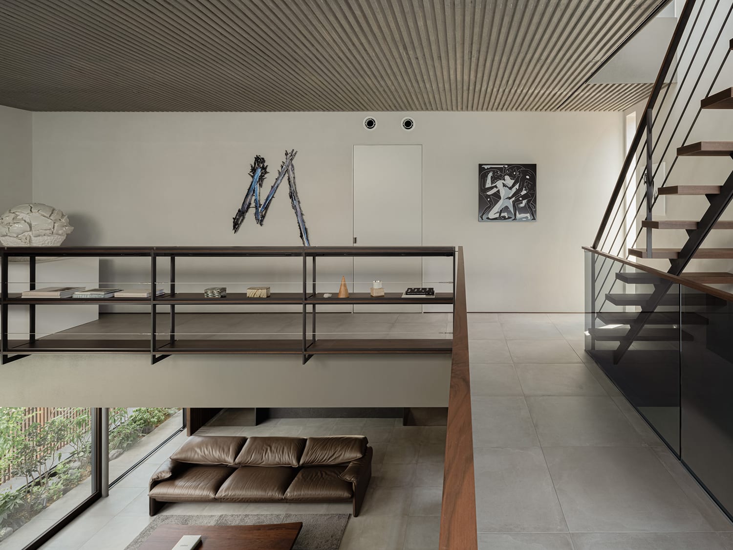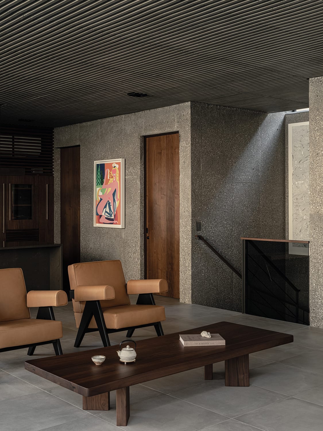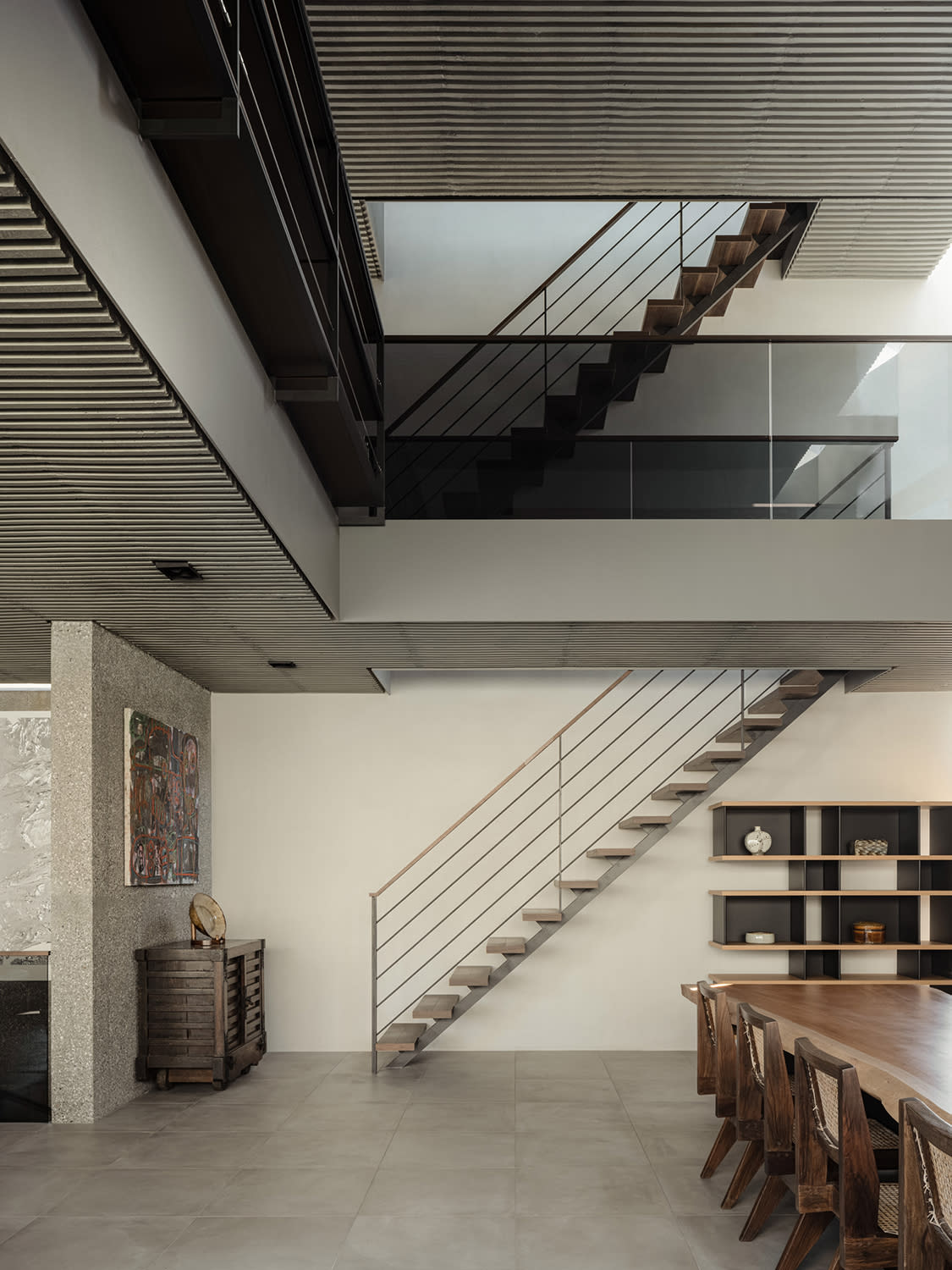 The modern furniture pieces are matched with “found’ items”, such as an Edo-period kuruma-dansu (wheeled chest) and a transitional folk art piece positioned beside the upper-level staircase “to harmonise with the exposed aggregate concrete finish”.