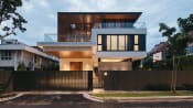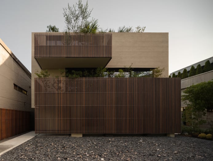 House in Aoyama is similar yet unique. Ashizawa conceived a crisp concrete box for the three-storey shell. Two balconies, wrapped with timber screens, protrude from the concrete box. Landscaping peeking out from above the screens softens the overall architecture.