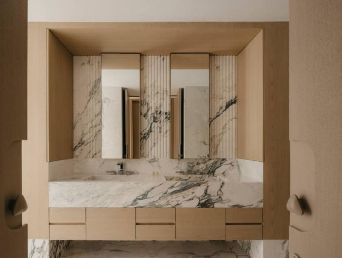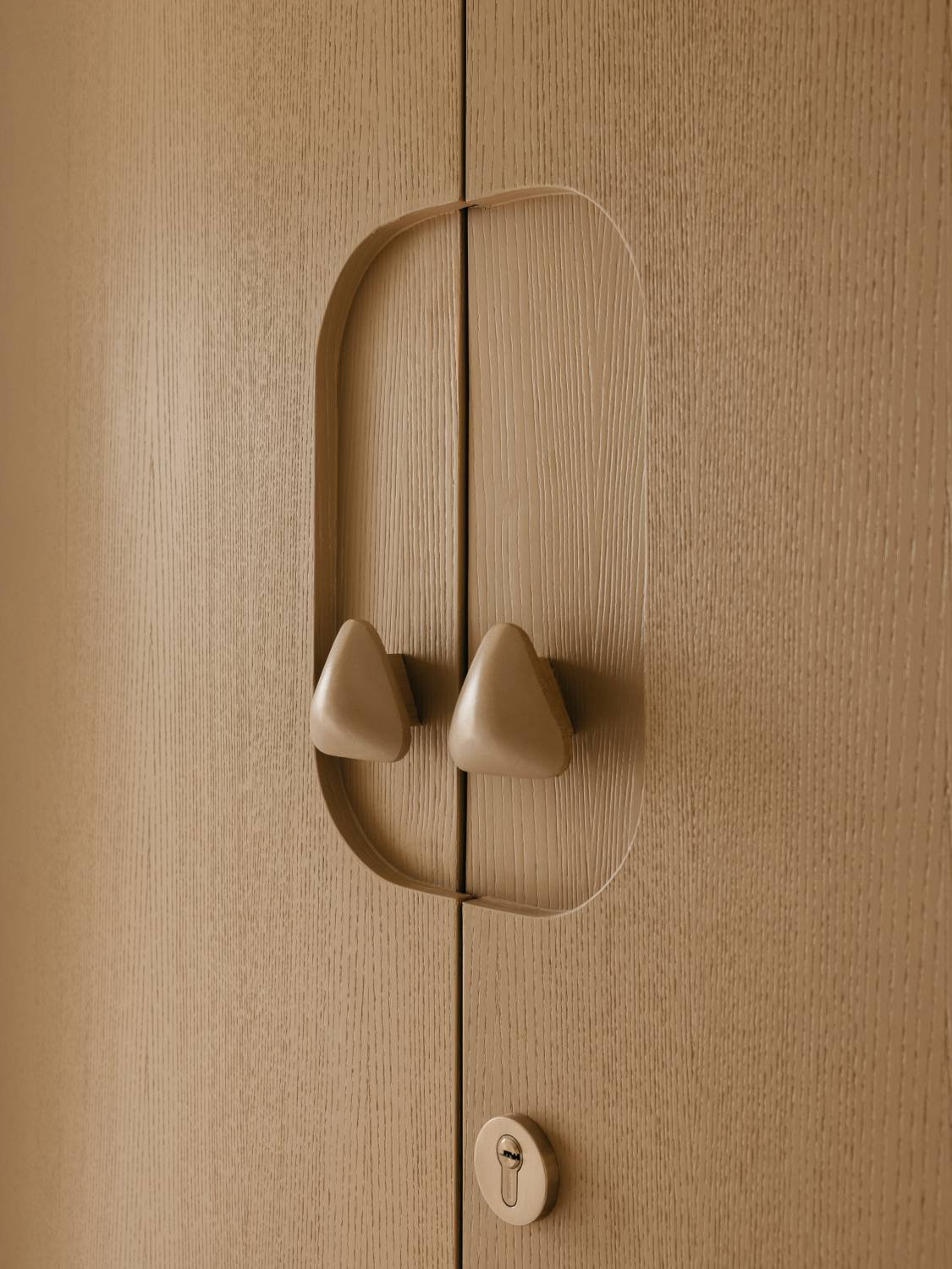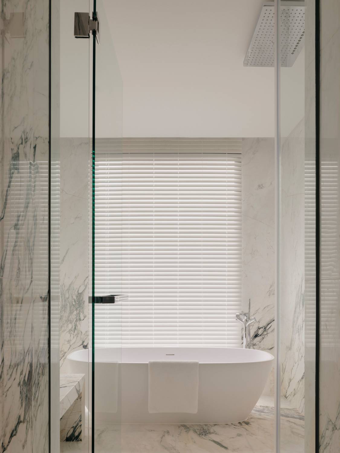 To elevate the everyday experience, Wu created double doors with custom handles for the master bedroom and walk-in wardrobe. Not surprisingly, the walk-in wardrobe, coloured cream and white for a feminine sensibility, has been given ample attention. In the centre is a chaise lounge and island cabinet for jewellery, and surrounding cabinets keep skincare products organised. “We wanted this to feel like Wanting’s own space after she returns home from a busy workday,” said Wu, who worked with wardrobe specialist Poliform to tailor suitable storage.