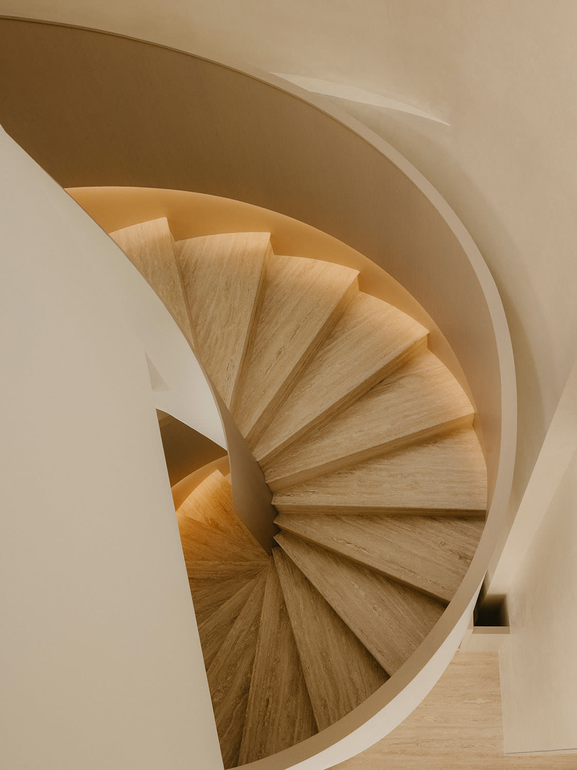 In the main areas, Wu chose furniture and finishes that are not only beautiful but also comfortable and robust to take the hard knocks of family life. The kitchen walls of Calacatta Primavera marble colour the predominantly white spaces with pattern, and a Connery sofa from Minotti with white upholstery echoes the white curves of the spiral staircase.
