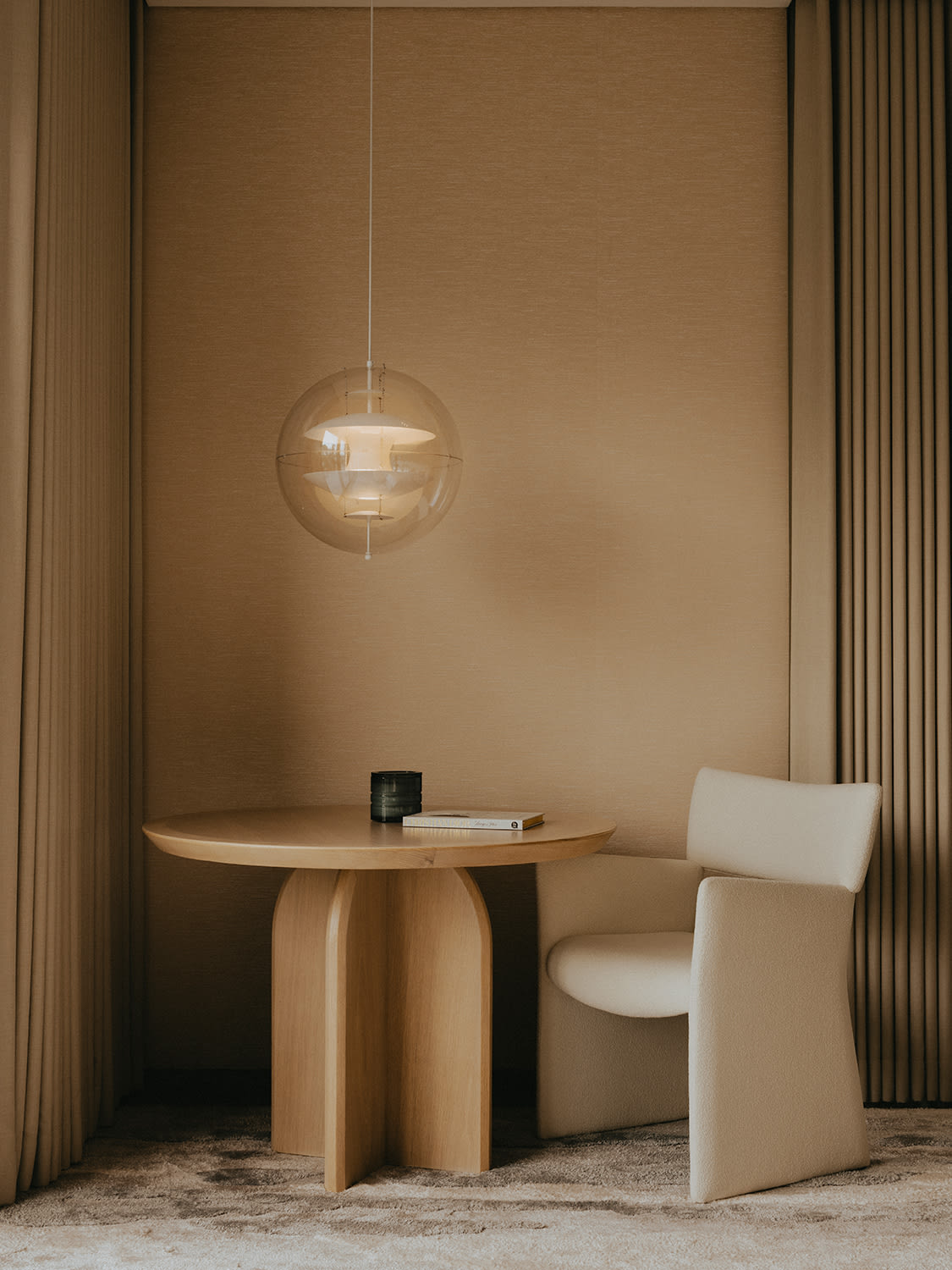 Wu chose a standout Manhattan Centre table from Elan Atelier to match the lamps, crafted from fully cast bronze with a parchment-lined top “that serves as a statement piece and a timeless heirloom,” she highlighted on the versatile surface for decor tailored to the different festive seasons. Wu often advises clients to pick some handcrafted furniture or lighting pieces to hand down to their children. Factory made pieces from known brands are easily manufactured but artisanal craft will become rarer over time.