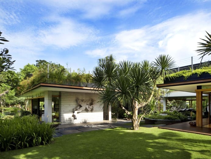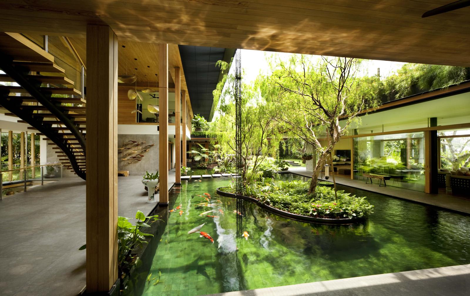 This spacious good class bungalow in Singapore is a tropical oasis filled with ponds and plants