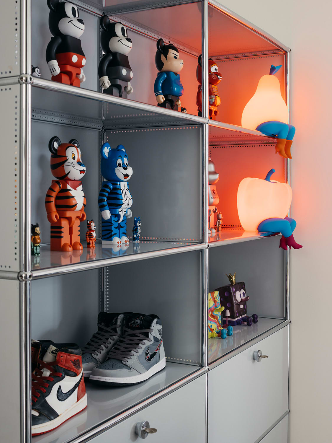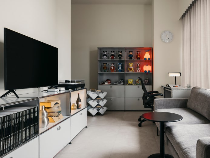 In the room is a USM console storing and showcasing some of these items. “The modularity of USM allows for me to change my set up according to what I want to display,” Beh shared on the Swiss furniture brand created in 1885 that has seen a resurging popularity in recent years (USM takes its initials from its founder, Ulrich Schärer, and Münsingen). Originally created for workplaces, the flexibilty of the units make them also suited for today's modern homes.