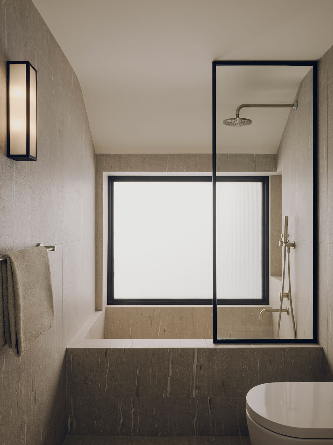 She also carved out a walk-in wardrobe, vanity and dresser from the existing plan. “For these spaces, the front lighting is always best for getting ready. Given the structural ceiling limitations in the master bathroom, we made use of wall lighting instead of ceiling down lights to adequately light the space,” Lim explained.