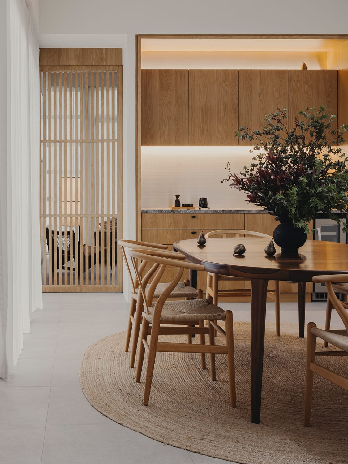 This is the piece de resistance of the penthouse. "Originally, there was an odd step up from the living room into the dining and back down again into the passageways; the dining area was also a horigotatsu, which was not great for the parents so we brought everything down to a single level," said Lim.