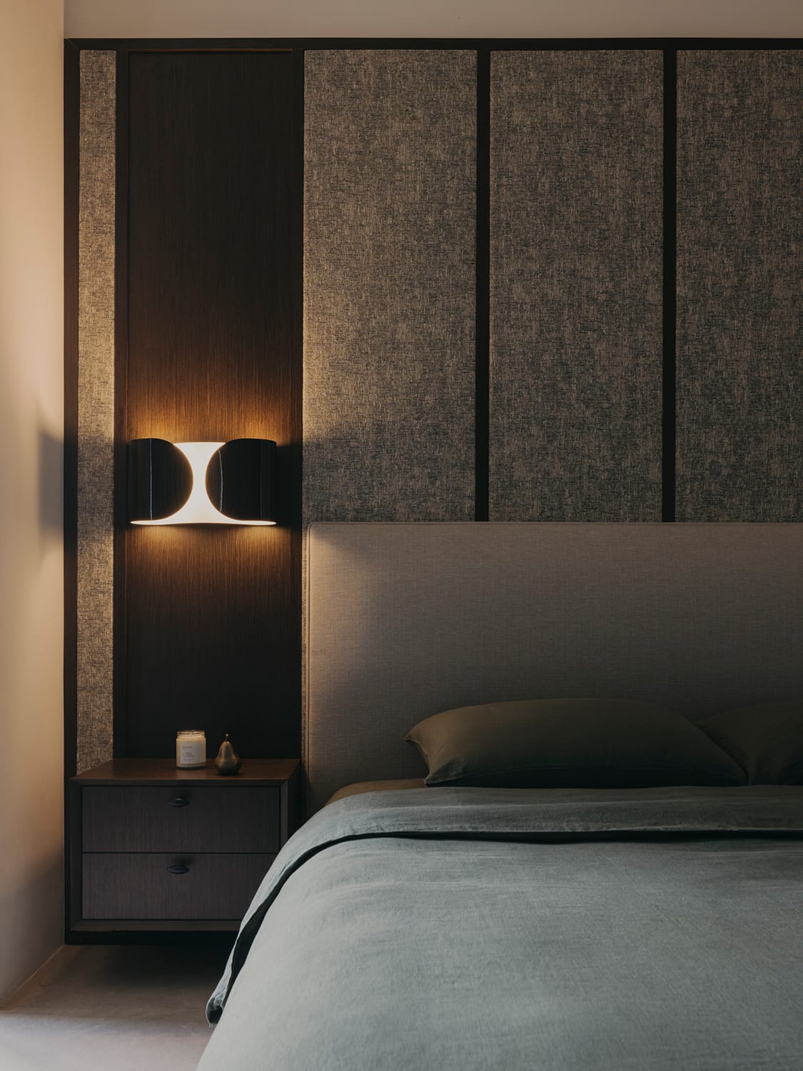 The master bedroom on the second level contrasts in mood. Beh wanted it to have the sophisticated and relaxed feel of a hotel so Lim created a fabric bedhead in soothing dark grey tones. Down lights are kept to a minimum in lieu of twin wall scones that light the space gently.