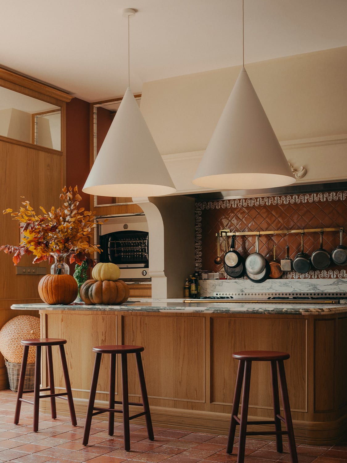 The rustic kitchen is presided over by two grand conical Wastberg lamps that appear like abstracted upside-down chefs hats. Walls of oak storage include glass-fronted cabinets showcasing Han’s collection of plates and crockery.