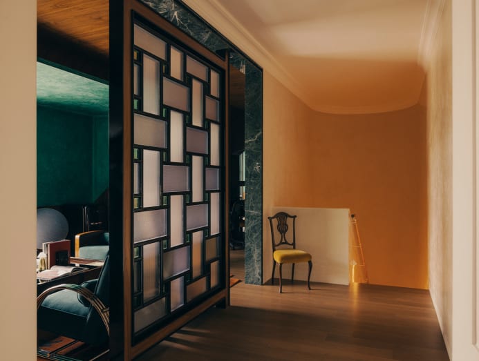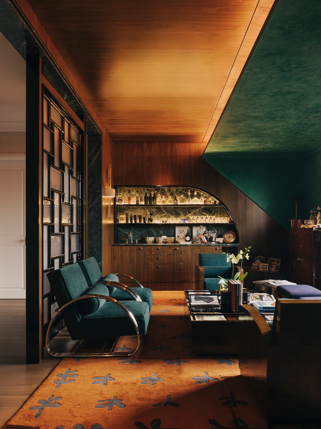 The library and doors to bedrooms encircle this void. One of the doors leads to the couple’s suite in the attic that has a dedicated bar area.. “We spend a lot of time here in the evenings,” said Lee. For the space, Shang was inspired by Italian architect Piero Portaluppi's classic Milanese modernist interiors. Rather than downplay the quirk of the slanted ceiling, he celebrated it with rich polished green stucco plaster.