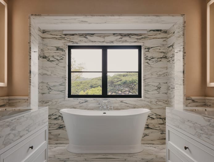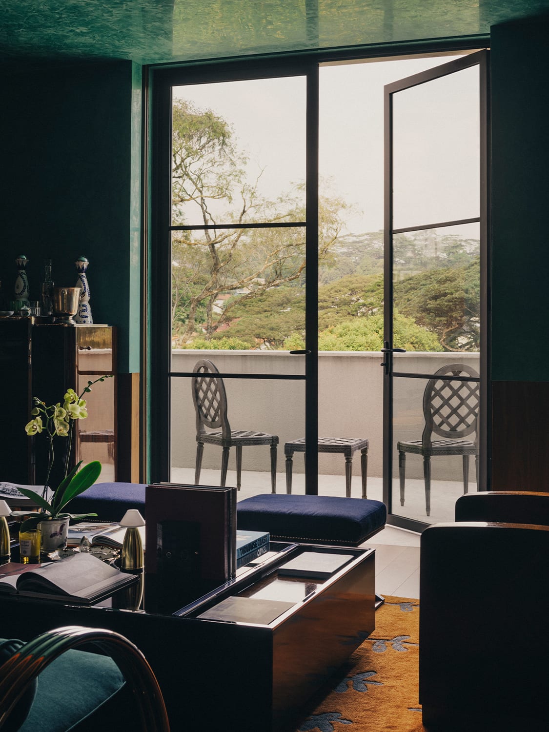 Symmetry, colour and proportion are carefully considered with features like teal- and artichoke-coloured silk panels, and dark green Verdi Alpi marble portals flanking a faux red travertine hearth in the living room. “It is always difficult to do a ‘fake’ fireplace in the tropics but here, the marble accents and scale make it a wonderful focal point,” said Shang.