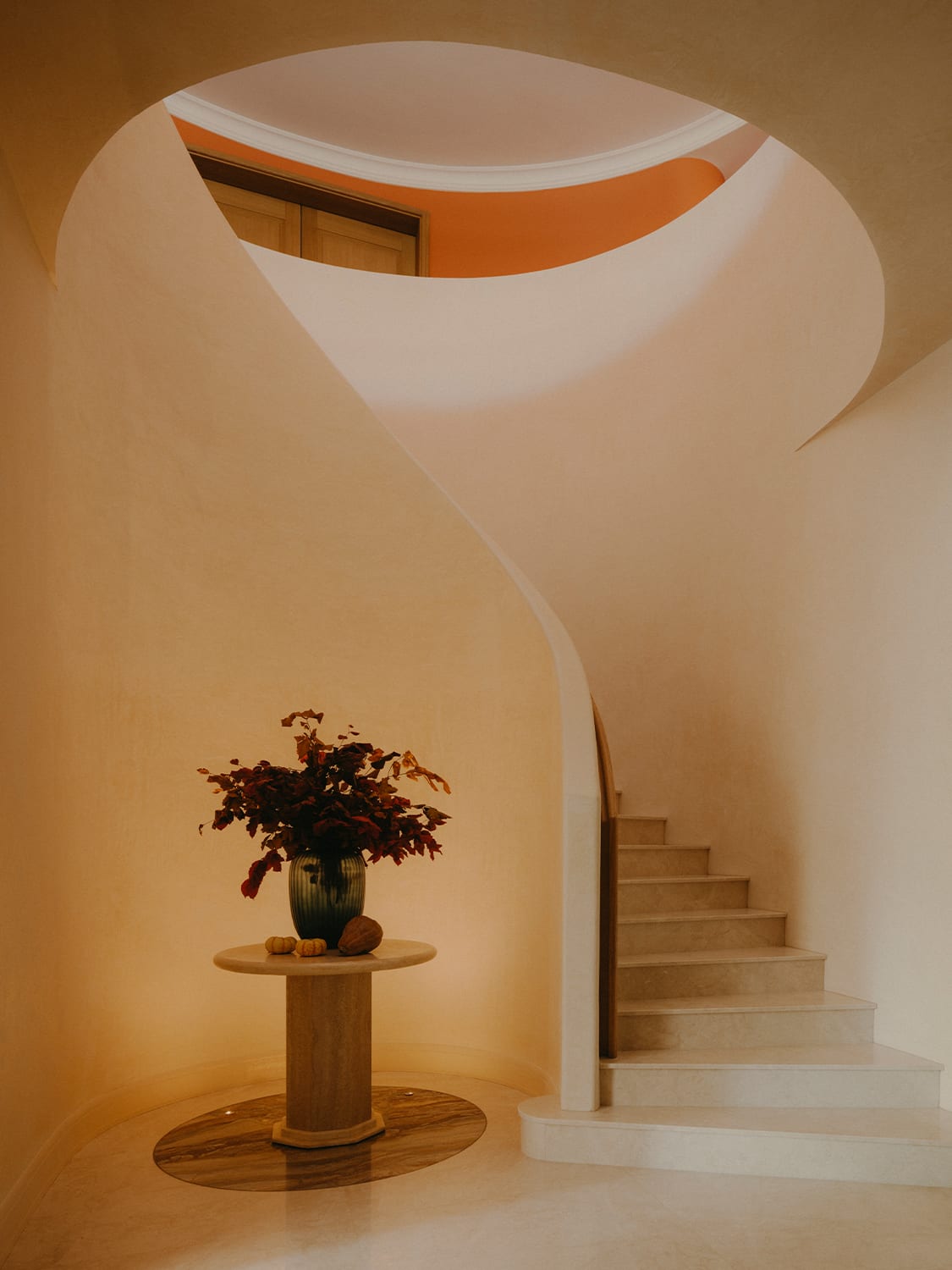 In the entrance vestibule, a statement staircase finished in smooth stucco curls gracefully to one side like a side-swept skirt, carving a void for Han to welcome guests with seasonal floral displays – for example, large bursts of yellow mimosa in spring and branches of autumn leaves in fall, accessories by pumpkins.