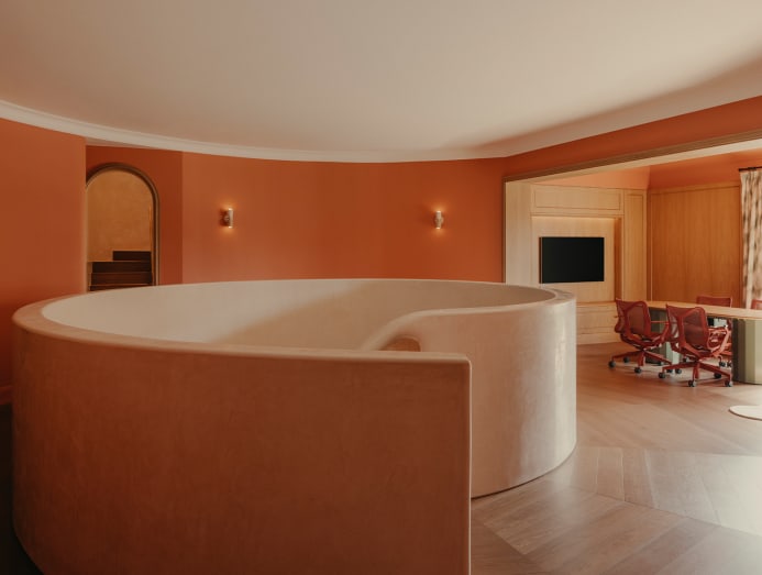 Arango observed that this connection between the inside and outside spaces “reinforces the open, relaxed spirit of the home, where boundaries between living, cooking and leisure are gently dissolved.” She and Molina had shifted the original driveway here to another side of the plot to allow for a bigger pool that they clad in the same red travertine as the kitchen floor in the style of Mediterranean kitchens.
