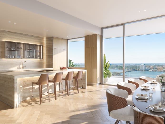 The apartments will also come fully furnished with the finest names in home and decor including Italian-designed Schiffini kitchens with 10-foot kitchen islands, Gaggenau appliances, Noorth bathtubs, Travertine floor and wall tiles, Gessi fixtures, Barausse frameless doors and more.