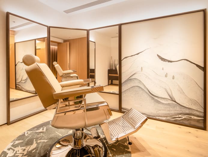 In the tea pavilion where there is a lounge setting for the enjoyment of tea drinking, Tan customised a dramatic eight-metre-long backdrop featuring an elaborate timber carving inspired by the handscroll painting Along the River During the Qingming Festival by famous Song Dynasty painter Zhang Zeduan. “Tea can be savoured in the lounge area or within the tea booth seating where another specially commissioned Chinese watercolour painting artwork is juxtaposed with a display of teacups sourced from all over the world,” she pointed out.
