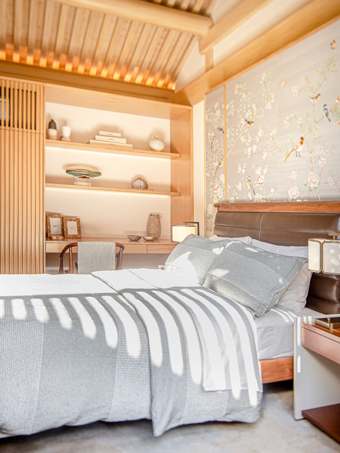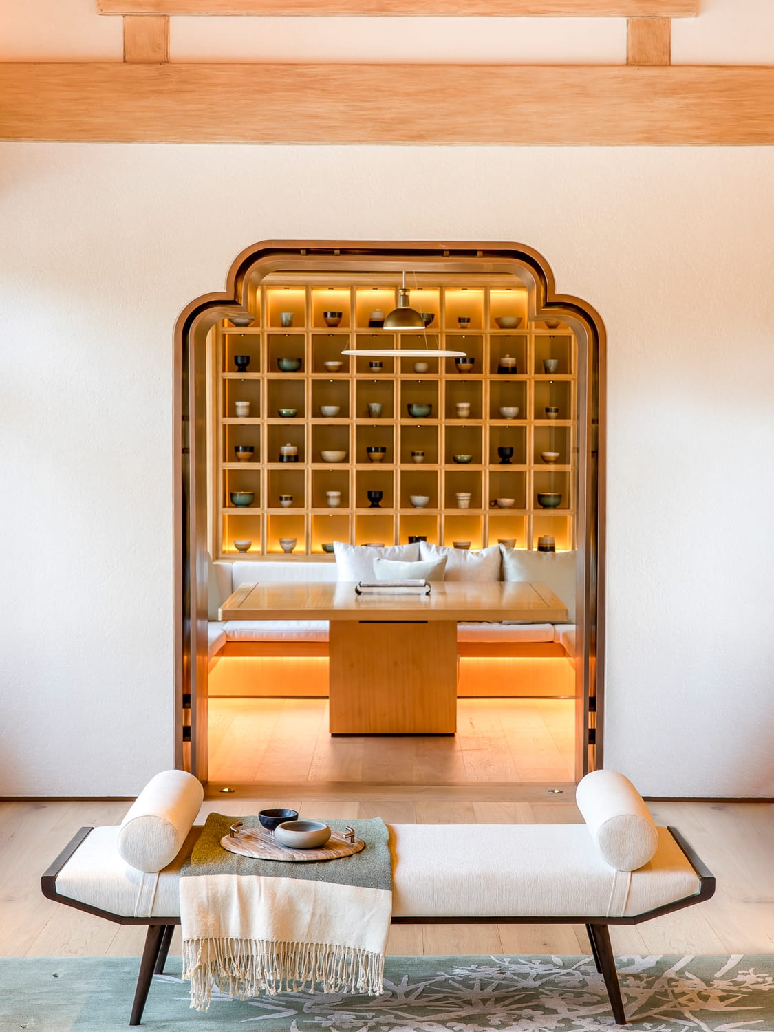 Private areas like the bedrooms are dressed in warmer hues. In the massage room, peach tones match the embroidered blossoms on the silk wallpaper while in the master bedroom, the same shade of peach matches the butterflies on the room’s folding screens.