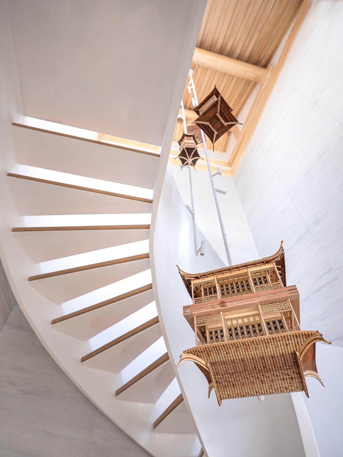 Another work of art is the spiral staircase leading to the basement – a modern sculpture juxtaposed against the historic shell. “It is a construction marvel in itself as it was built without disrupting the existing structures above,” said Tan. Above the staircase floats interesting custom lamps made by inserting lighting into timber models of Chinese traditional buildings.