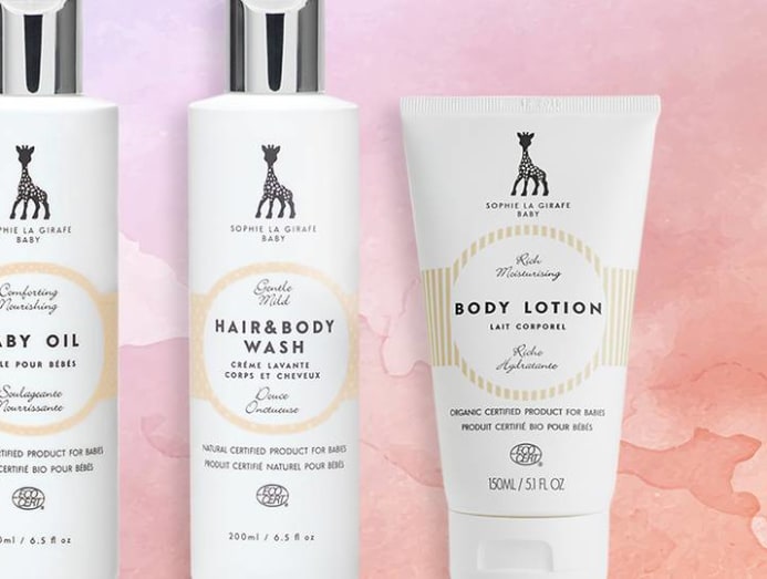 Sophie la girafe Baby Body Lotion, €18.98 (S$29); Hair & Body Wash, €16.98; Baby Oil, €19.98.