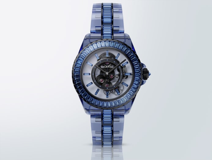 However, it’s the J12 Bleu X-Ray Watch that is a scene-stealer. Boasting a price of almost S$1.62 million, the 12-piece limited edition evokes the serene tones of the sea and sky on a clear day. Over 1,600 hours of work were needed to sculpt its case and bracelet from a single block of synthetic blue sapphire. Its bezel is set with 196 baguette-cut blue sapphires, while a skeletonised dial showcases the manually wound Calibre 3.1. Colourless sapphire bridges and plates create an otherworldly effect, giving the architectural movement the appearance of floating weightlessly within the case.