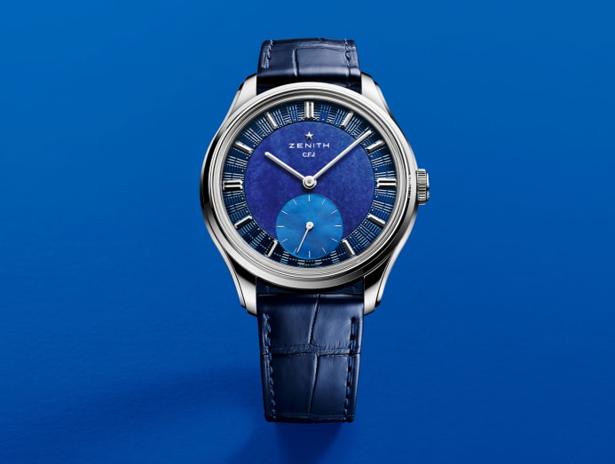 A 39.15mm platinum case with a stepped bezel and lugs frames a dial in the brand’s signature blue. Its three-part construction boasts an outer ring with a brick guilloche pattern, which draws from the facade of Zenith’s historic manufacture. Its centre is made from deep, blue lapis lazuli, whose gold pyrite flecks evoke a starry sky. The stone’s natural texture means no two dials are alike. Meanwhile, an oversized subdial at 6 o’clock indicating the passing seconds is executed in mother-of-pearl.