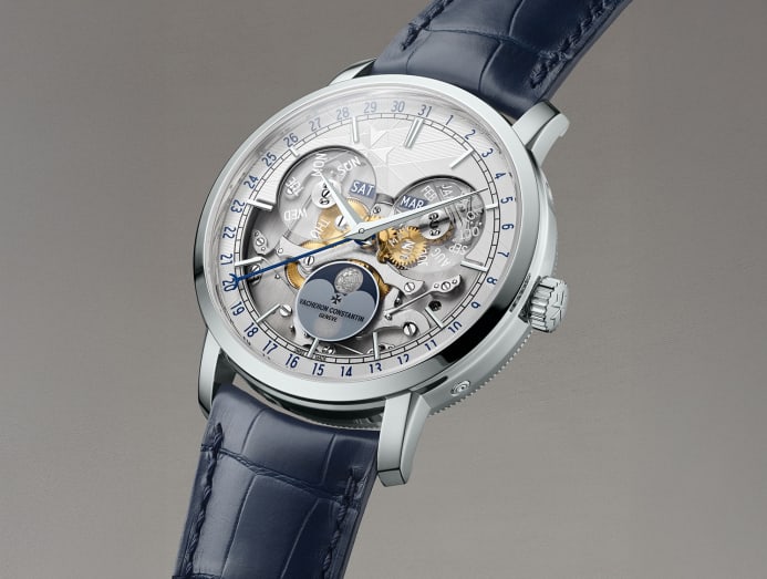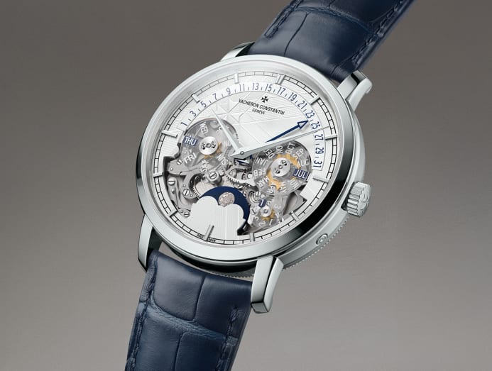 Rounding out the trilogy is the Traditionnelle Complete Calendar Openface. Equipped with the Calibre 2460 QCL/270, it puts the triple calendar front and centre. The day and month are displayed via sapphire discs, while the date is displayed around the periphery of the dial and indicated by a blued central hand. At 6 o’clock is a moonphase that’s accurate for 122 years. As with the other two timepieces, this model fuses classic watchmaking with a refined aesthetic enhanced by the openface design.