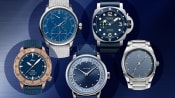 The 160-piece limited edition comes with three straps: Dark blue alligator, black calfskin, and blue Saffiano leather. Serious collectors can opt for a luxurious seven-row platinum bracelet featuring centre links embossed with a brick pattern.