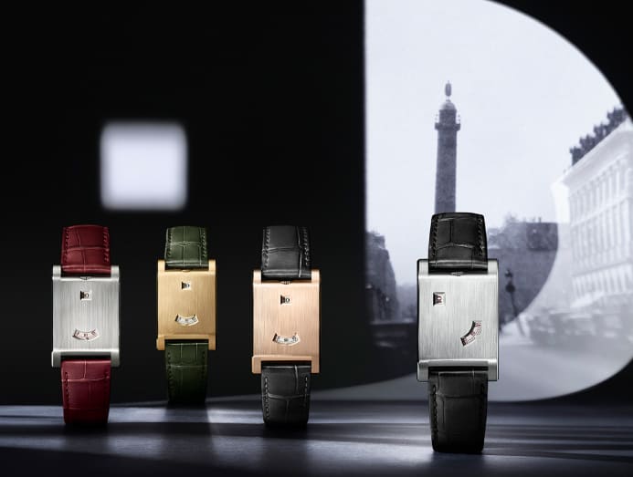Retaining the design purity of the original, the new Tank a Guichets features twin apertures – hours at 12 o’clock and minutes at 6 o’clock – driven by the new hand-wound calibre 9755 MC. Like its predecessor, the winding crown is set discreetly at the top of the case to maintain the watch’s stark geometry. Measuring 37.6mm by 24.8mm and just 6mm slim, the satin-finished case is available in platinum, rose or yellow gold, each accented by polished brancards for added architectural interest. A fourth reference in platinum, limited to 200 pieces, features the two apertures positioned at an angle, a design element that pays tribute to the creativity of the 1930s.