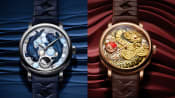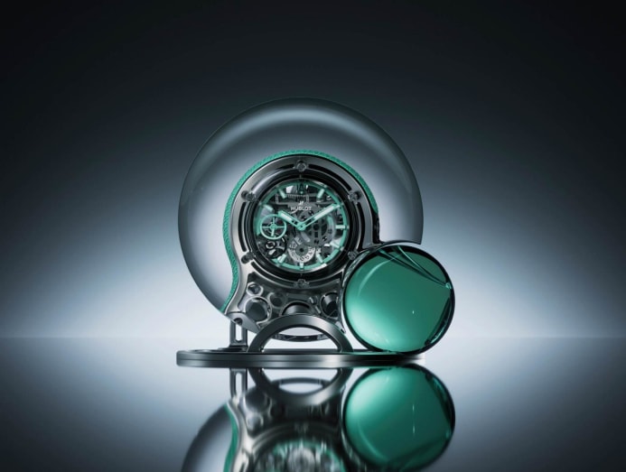 The Arsham Droplet features a sandwich construction with two finely crafted domed teardrop-shaped crystals. The open-worked titanium case mimics delicate lace woven into a droplet pattern, and the side bumpers, made of custom Arsham Green rubber, bear the artist’s monogram. The case’s double sealing system, with 17 O-ring seals, ensures a perfect seal. Signature Hublot design elements such as the six H-shaped screws, are also present.